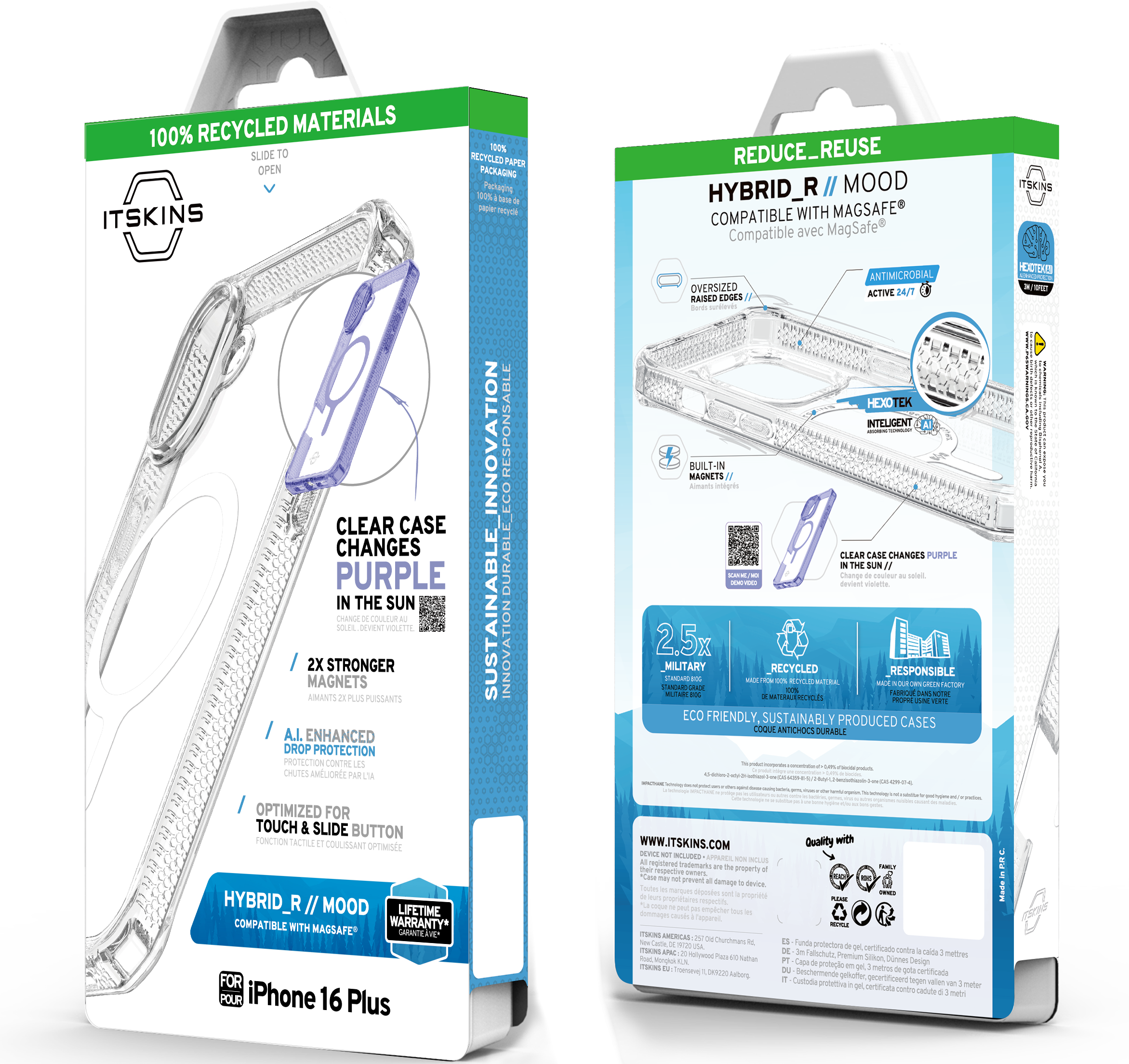 HYBRID_R MOOD : For the Fun-Loving Trendsetter: This iPhone Case Transforms Color in Sunlight, features a crystal-clear rigid polycarbonate back that showcases your phone's beautiful finish, 2X Stronger MagSafe, and AI-Enhanced 3M / 10ft Drop Defense. Global Recycled Standard Certified, with an Eco-Friendly design incorporating Air-Pocket Corners, Antimicrobial Protection, and Responsive Buttons. Lifetime Warranty for the Vibrant Explorer.