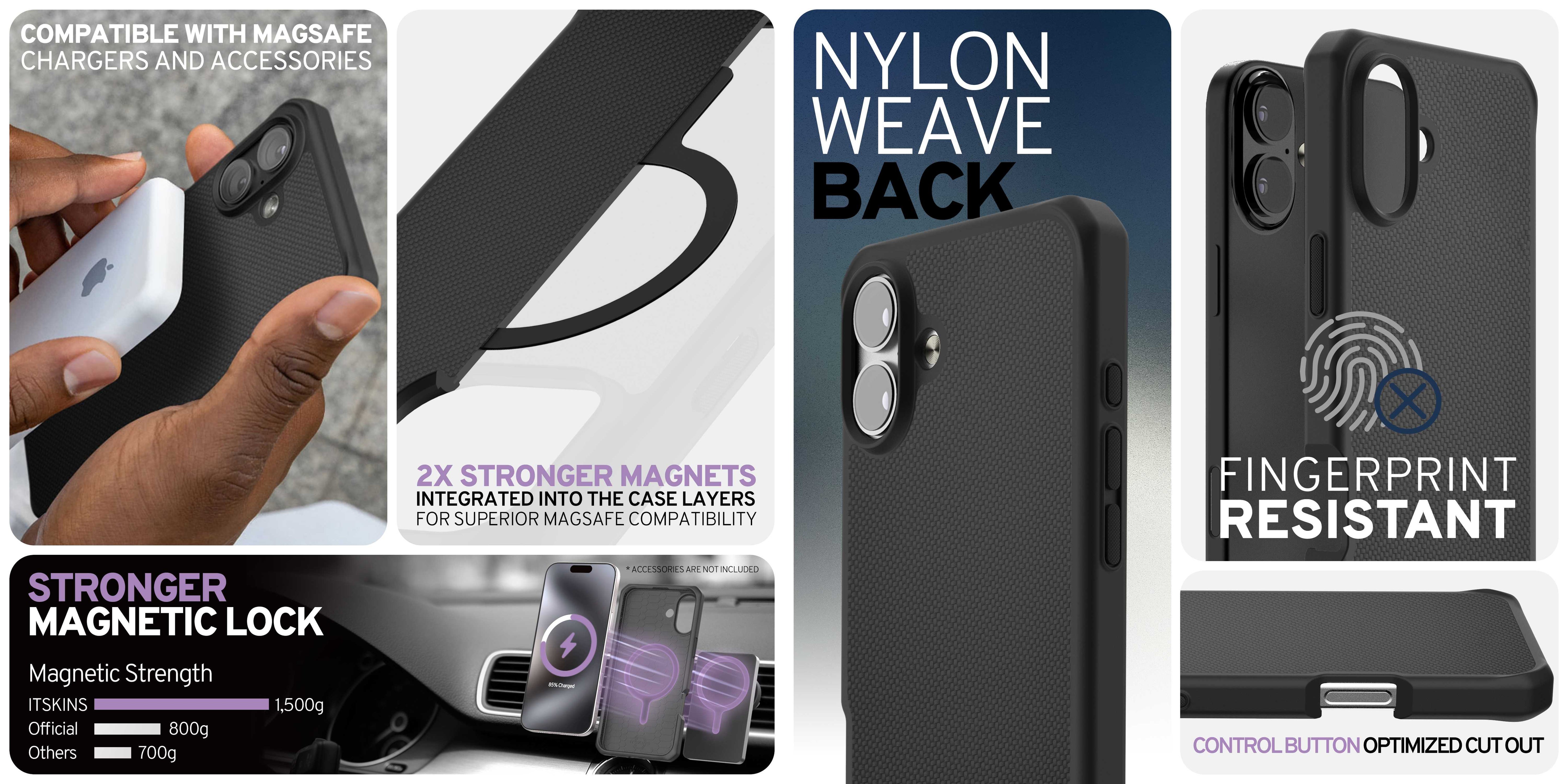 HYBRID_R NYLON : Combines a ballistic nylon weave back for rugged style and durability with a textured solid bumper for enhanced grip. It boasts a 2X Stronger MagSafe for secure attachment, is AI-enhanced to withstand drops up to 3m / 10ft, and is eco-friendly with Global Recycled Standard Certification. Includes features like air-pocket corners, antimicrobial protection, and responsive buttons, making it perfect for an active lifestyle, all supported by a lifetime warranty.