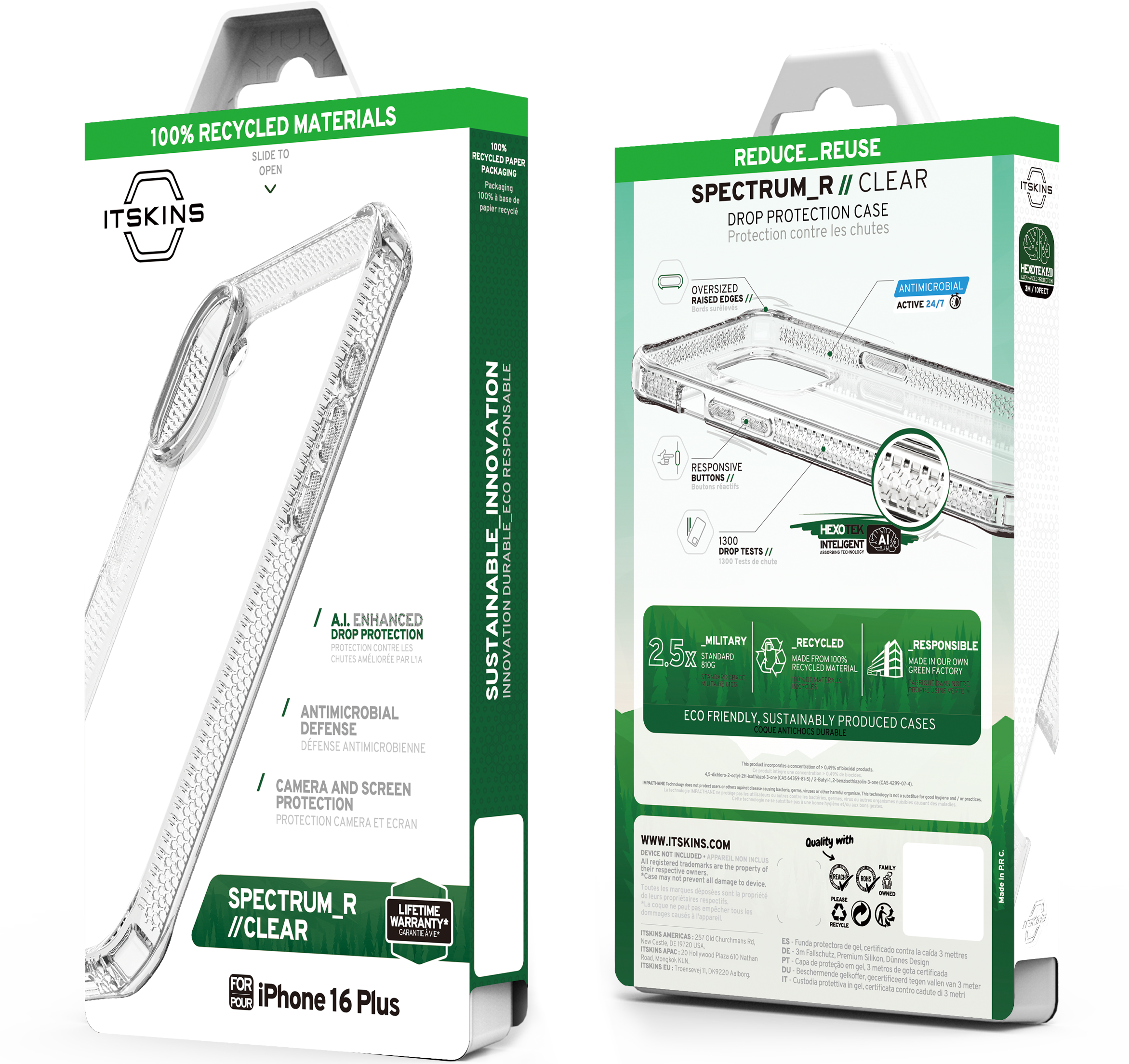 SPECTRUM_R CLEAR : Proprietary True Clear, Certified Recycled, Mono-Material for Simplified Recycling. Offers AI-Enhanced Drop Protection up to 3M / 10FT, Superior Anti-Yellowing, and Antimicrobial Defense.
