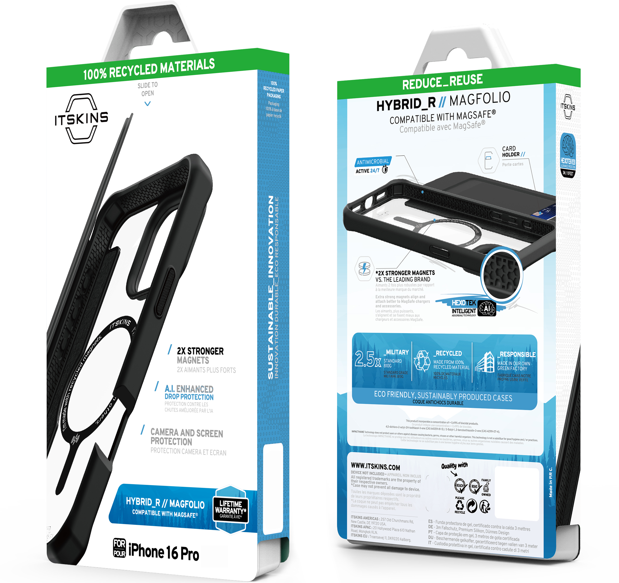 HYBRID_R FOLIO : Offers complete 360 protection for your device with its folio design, which can also hold credit cards or a driver's license and function as a stand. Features a textured solid bumper for enhanced grip, a never-yellowing, crystal clear rigid polycarbonate back that showcases the beautiful finish of your phone, melded with 2x stronger MagSafe and AI-enhanced 3M / 10ft drop defense. Eco-conscious with Global Recycled Standard certification, includes air-pocket corners, antimicrobial protection, and tactile buttons—Adventure-ready with a lifetime warranty.