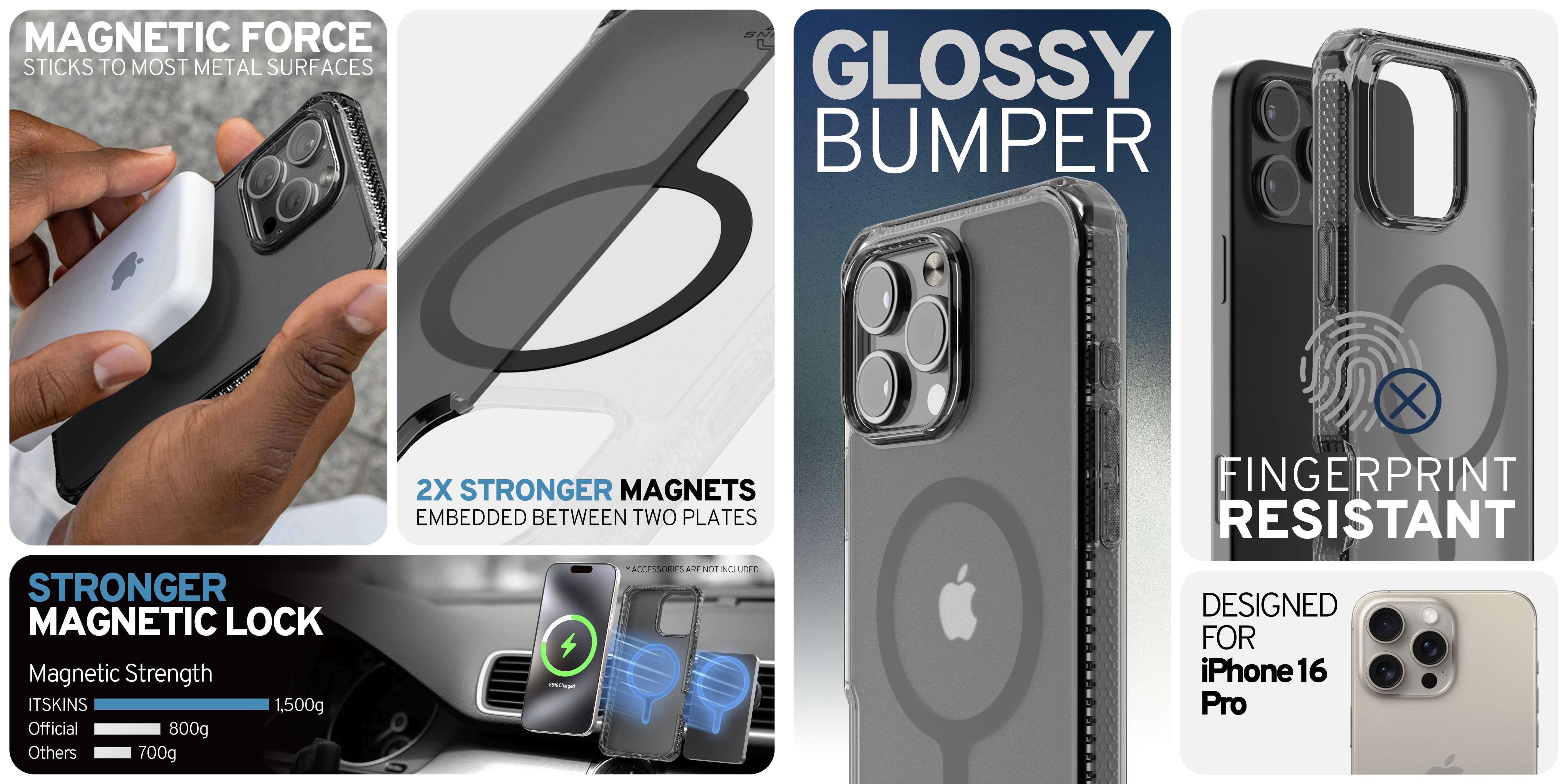 HYBRID R VAPOR : combines a sleek, matte frosted hardback with a glossy clear bumper, showcasing your phone's titanium trim. Its fingerprint-resistant, anti-scratch back surface maintains beauty over time. It is integrated with 2X Stronger MagSafe for secure attachment, AI-optimized for up to 3M / 10ft drop protection, and eco-friendly with Global Recycled Standard Certification. Equipped with air-pocket corners, antimicrobial defense, and responsive buttons, it's prepared for any adventure with a Lifetime Warranty.