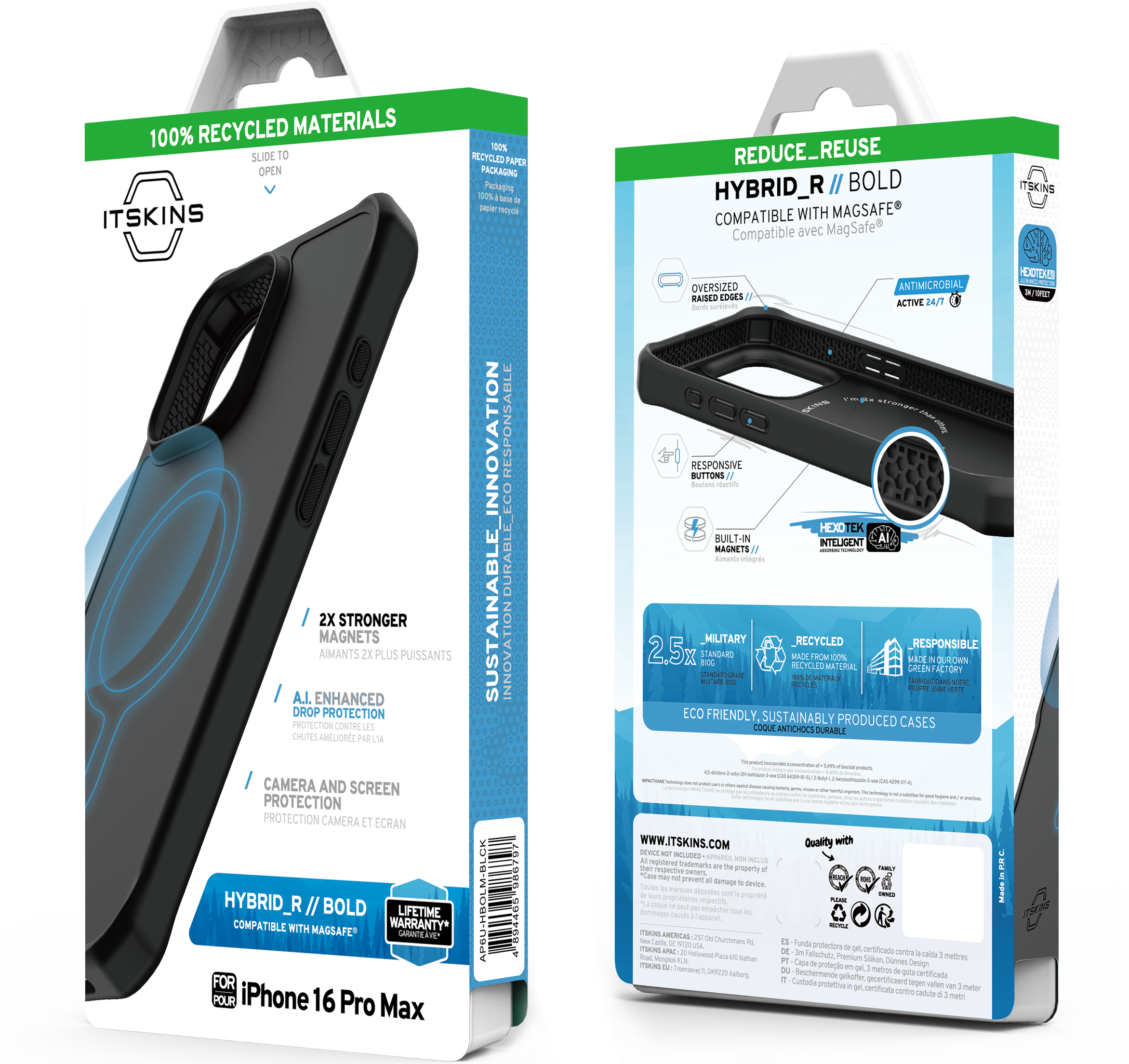 HYBRID R BOLD : features a sleek, blacked-out design with a fingerprint-resistant silk black back and a textured solid bumper for enhanced grip. Its anti-scratch back surface keeps the case looking pristine over time. Integrated with 2X Stronger MagSafe for secure attachment, AI-optimized for up to 3M / 10ft drop protection, and eco-friendly with Global Recycled Standard Certification. Equipped with air-pocket corners, antimicrobial defense, and responsive buttons, it's adventure-ready with a Lifetime Warranty.