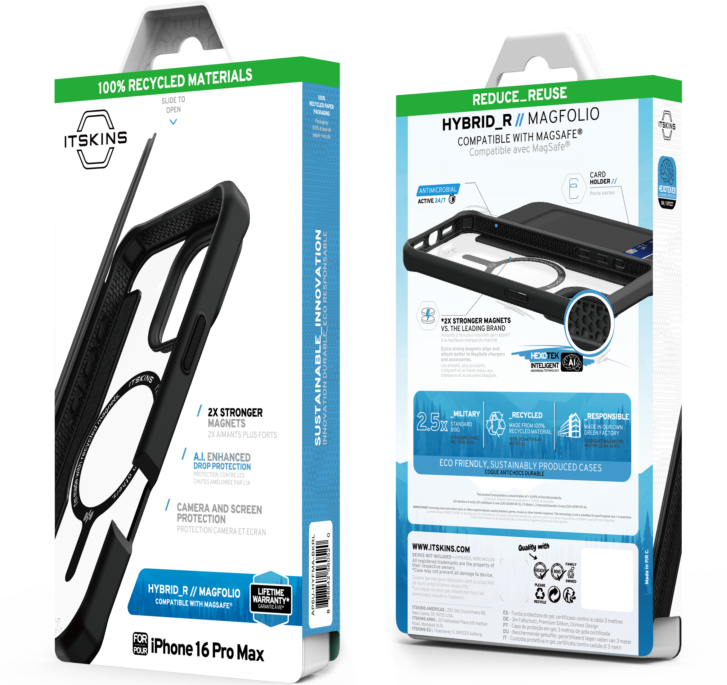 HYBRID_R FOLIO : Offers complete 360 protection for your device with its folio design, which can also hold credit cards or a driver's license and function as a stand. Features a textured solid bumper for enhanced grip, a never-yellowing, crystal clear rigid polycarbonate back that showcases the beautiful finish of your phone, melded with 2x stronger MagSafe and AI-enhanced 3M / 10ft drop defense. Eco-conscious with Global Recycled Standard certification, includes air-pocket corners, antimicrobial protection, and tactile buttons—Adventure-ready with a lifetime warranty.