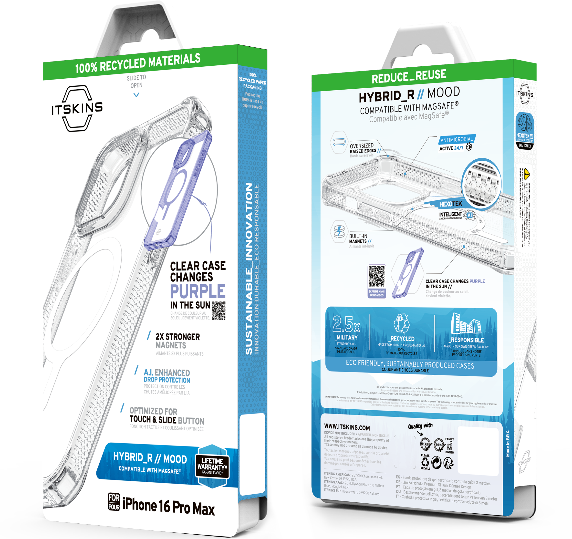 HYBRID_R MOOD : For the Fun-Loving Trendsetter: This iPhone Case Transforms Color in Sunlight, features a crystal-clear rigid polycarbonate back that showcases your phone's beautiful finish, 2X Stronger MagSafe, and AI-Enhanced 3M / 10ft Drop Defense. Global Recycled Standard Certified, with an Eco-Friendly design incorporating Air-Pocket Corners, Antimicrobial Protection, and Responsive Buttons. Lifetime Warranty for the Vibrant Explorer.