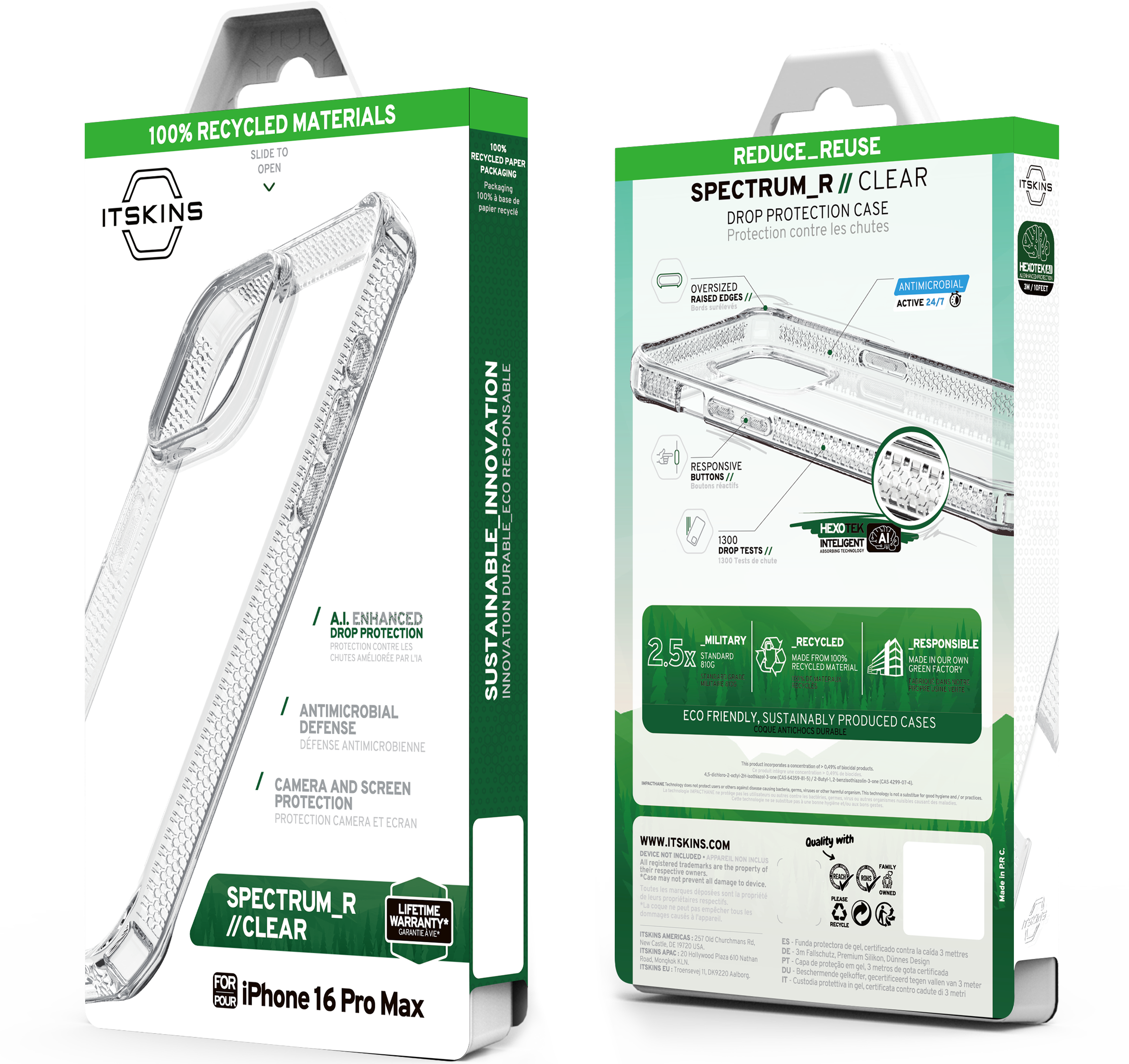 SPECTRUM_R CLEAR : Proprietary True Clear, Certified Recycled, Mono-Material for Simplified Recycling. Offers AI-Enhanced Drop Protection up to 3M / 10FT, Superior Anti-Yellowing, and Antimicrobial Defense.