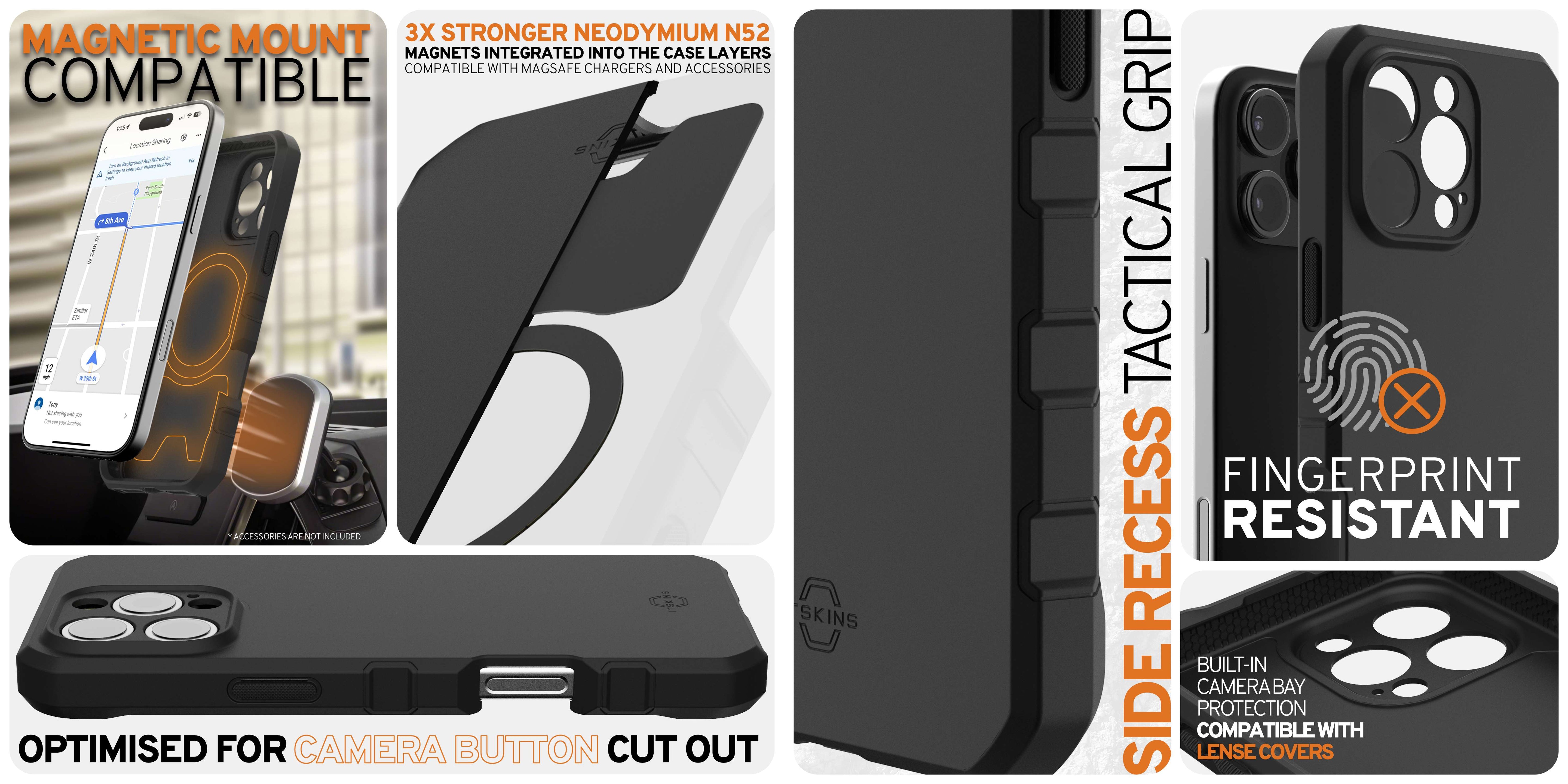 SUPREME R meets MIL-SPECS for military-grade defense, includes a tactical grip for enhanced hand security, and comes with detachable port covers for added protection. Engineered with XXL Air Corners for top-tier impact deflection. Boasts a 3X Stronger MagSafe for maximum attachment strength with accessories.