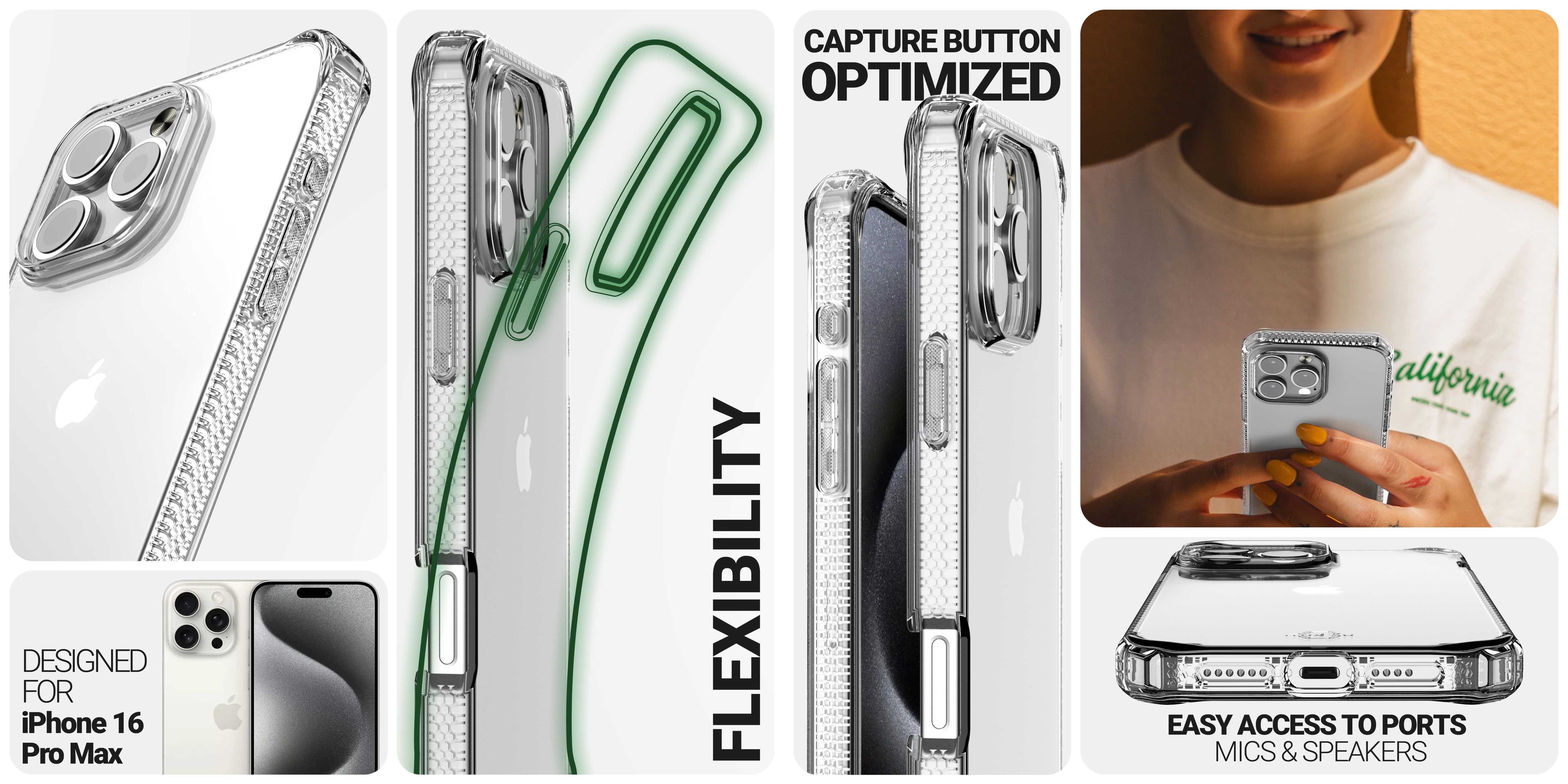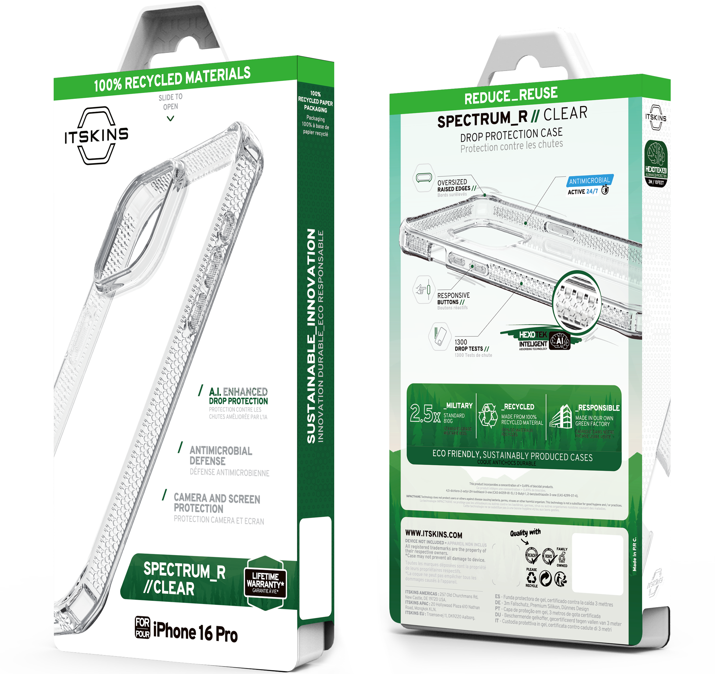 SPECTRUM_R CLEAR : Proprietary True Clear, Certified Recycled, Mono-Material for Simplified Recycling. Offers AI-Enhanced Drop Protection up to 3M / 10FT, Superior Anti-Yellowing, and Antimicrobial Defense.