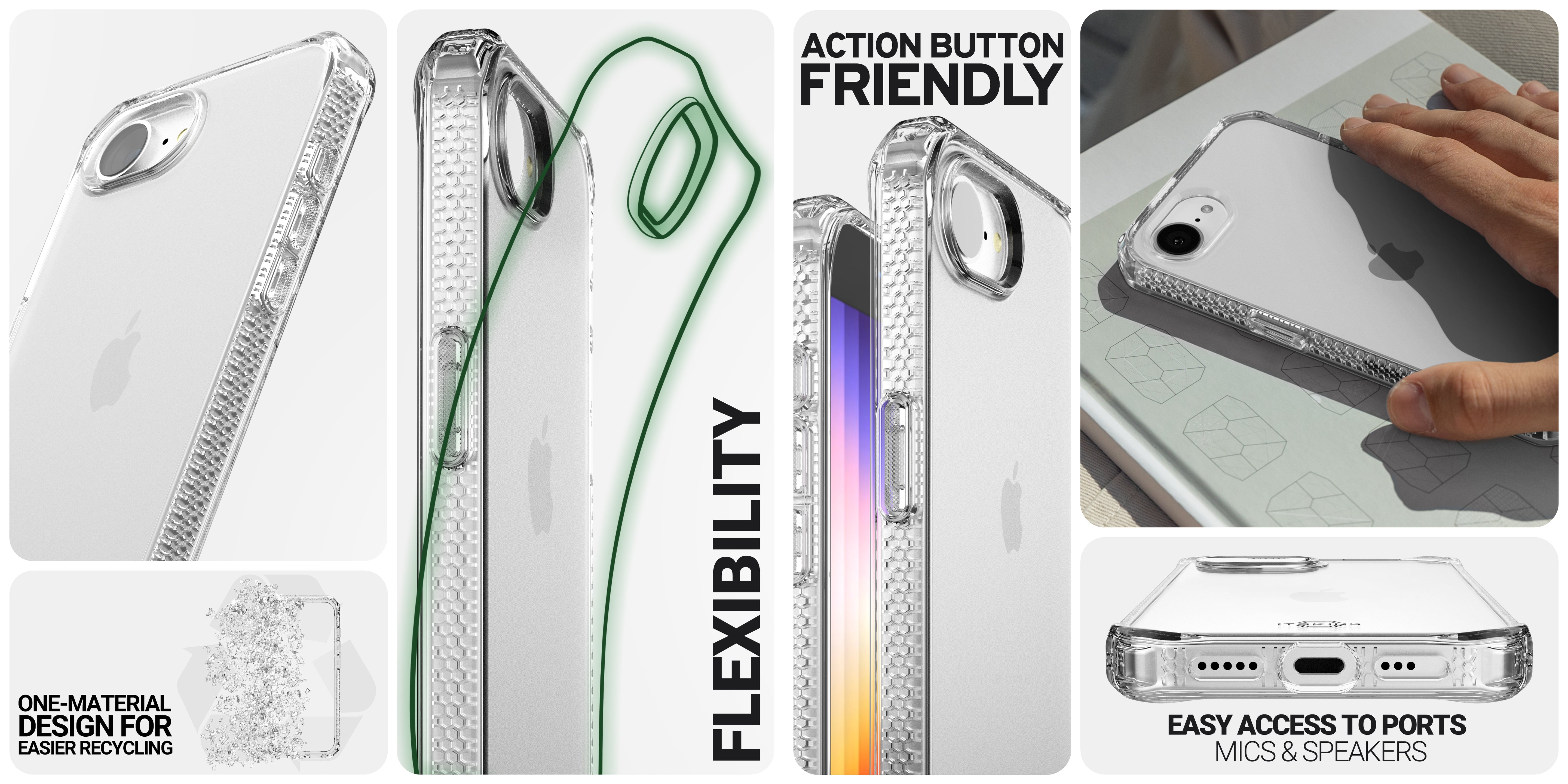 SPECTRUM_R CLEAR : Proprietary True Clear, Certified Recycled, Mono-Material for Simplified Recycling. Offers AI-Enhanced Drop Protection up to 3M / 10FT, Superior Anti-Yellowing, and Antimicrobial Defense.
