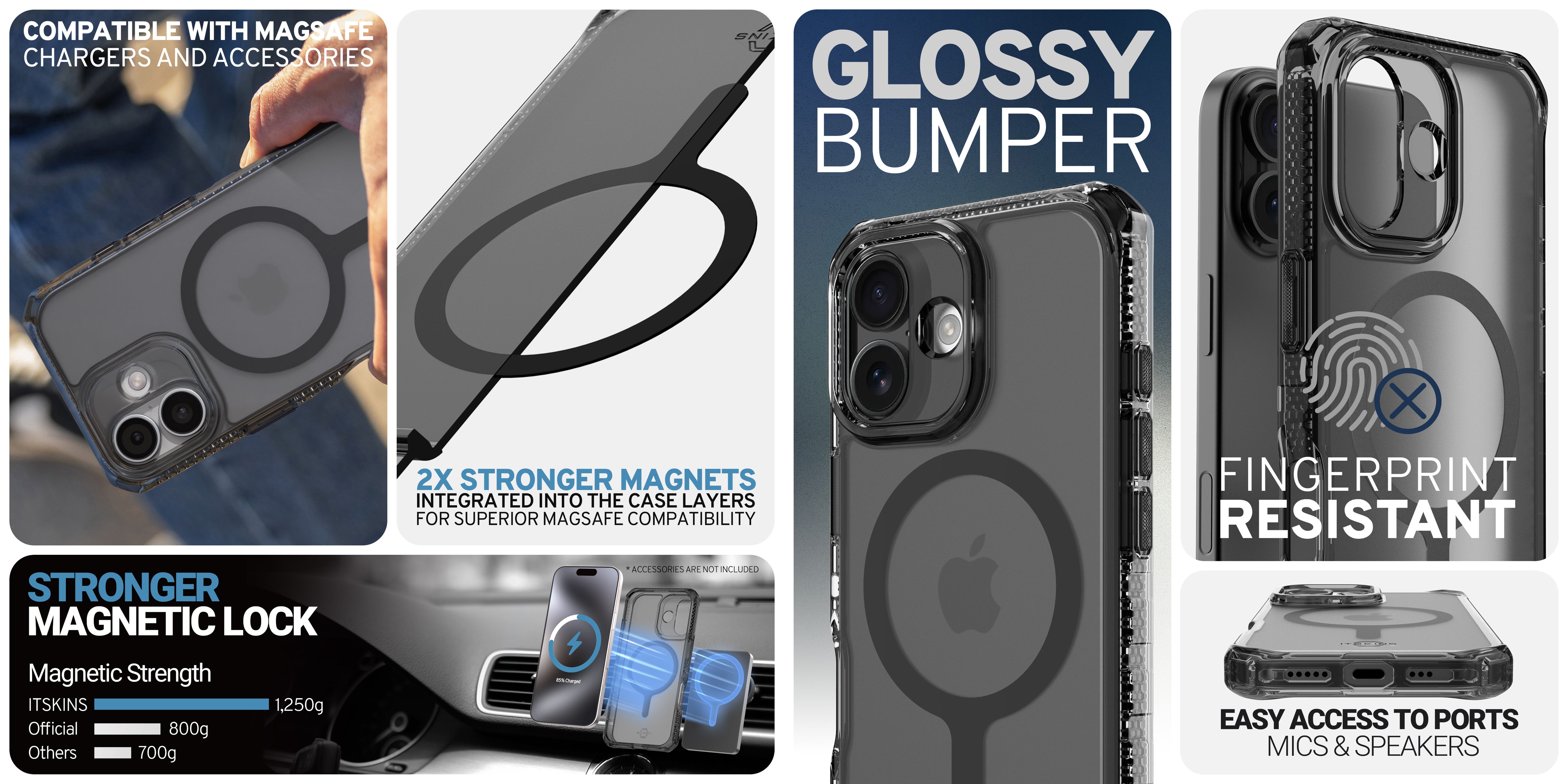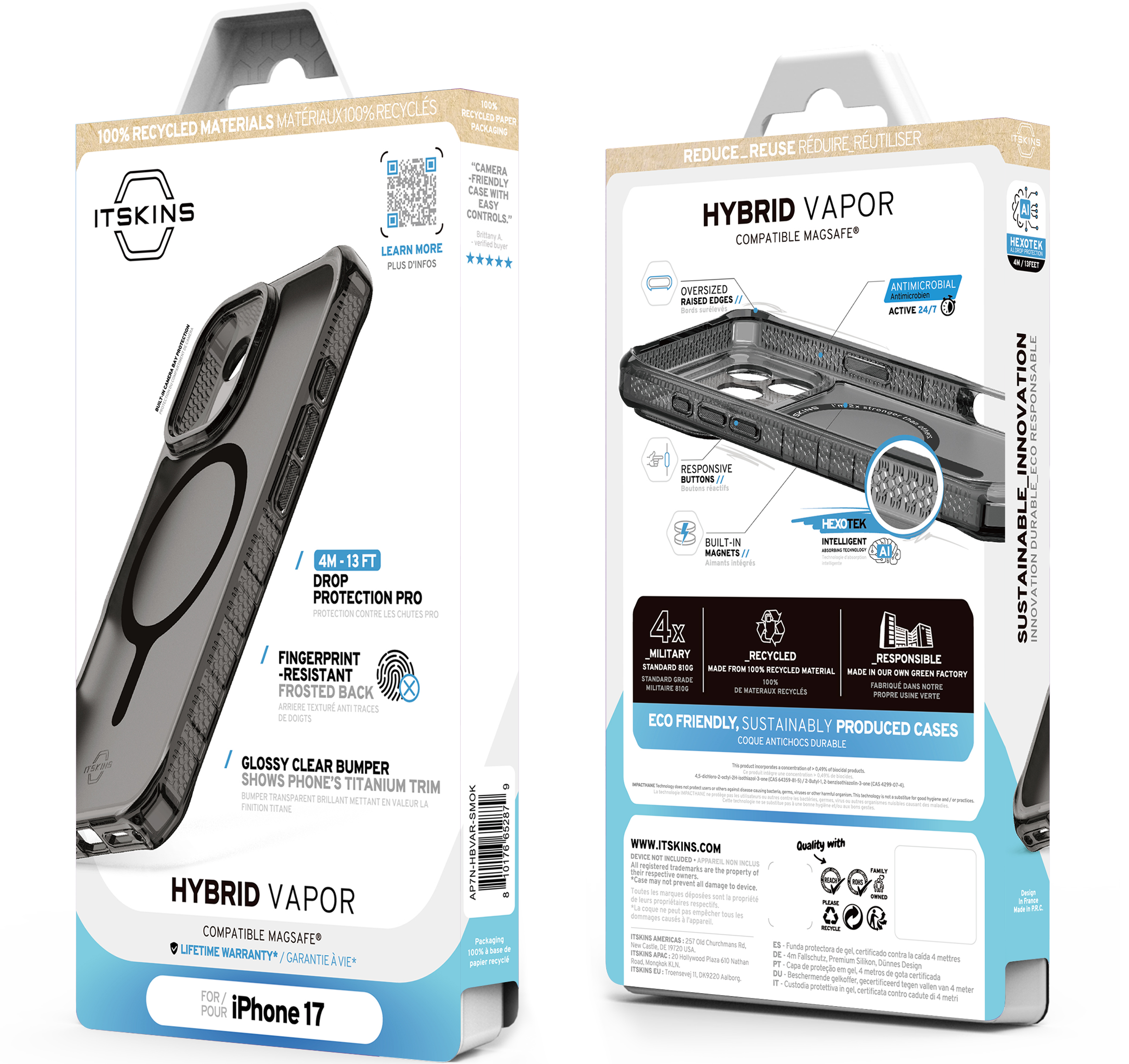 HYBRID R VAPOR : combines a sleek, matte frosted hardback with a glossy clear bumper, showcasing your phone's titanium trim. Its fingerprint-resistant, anti-scratch back surface maintains beauty over time. It is integrated with 2X Stronger MagSafe for secure attachment, AI-optimized for up to 3M / 10ft drop protection, and eco-friendly with Global Recycled Standard Certification. Equipped with air-pocket corners, antimicrobial defense, and responsive buttons, it's prepared for any adventure with a Lifetime Warranty.