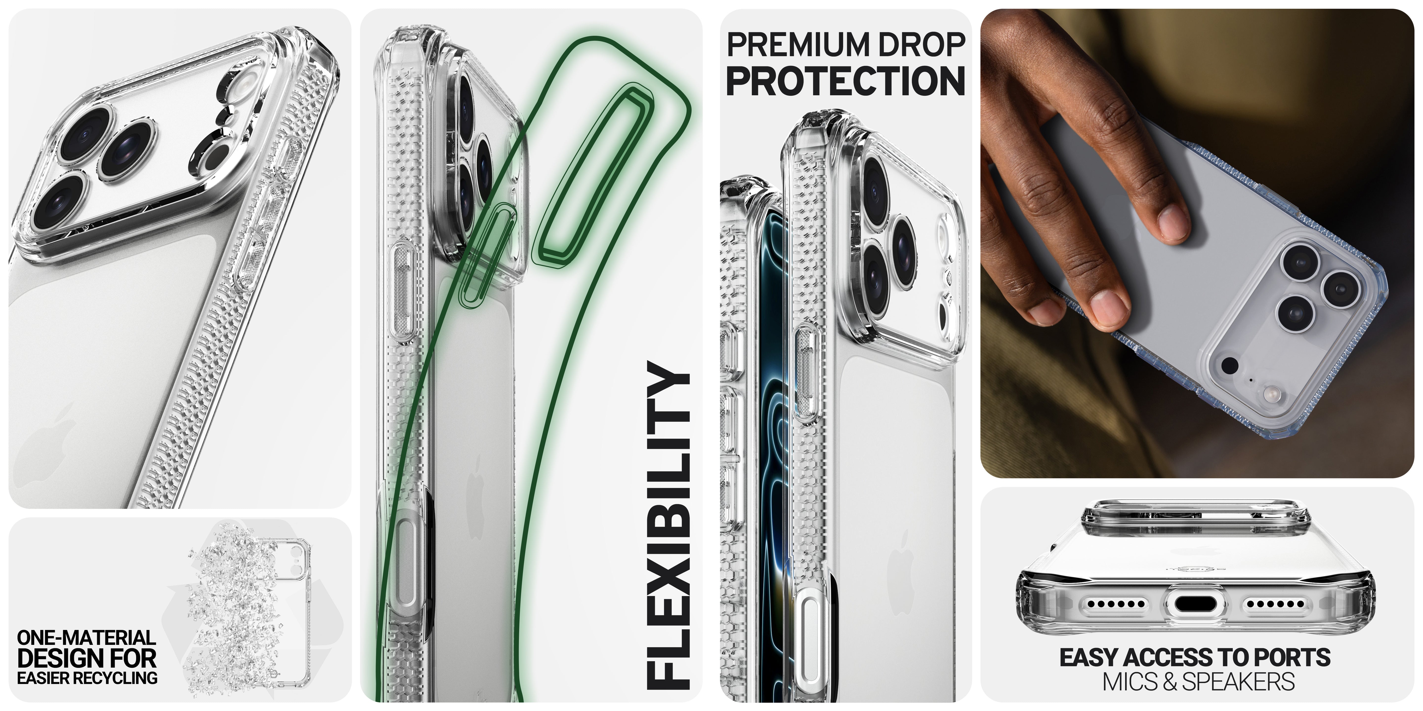 SPECTRUM_R CLEAR : Proprietary True Clear, Certified Recycled, Mono-Material for Simplified Recycling. Offers AI-Enhanced Drop Protection up to 3M / 10FT, Superior Anti-Yellowing, and Antimicrobial Defense.