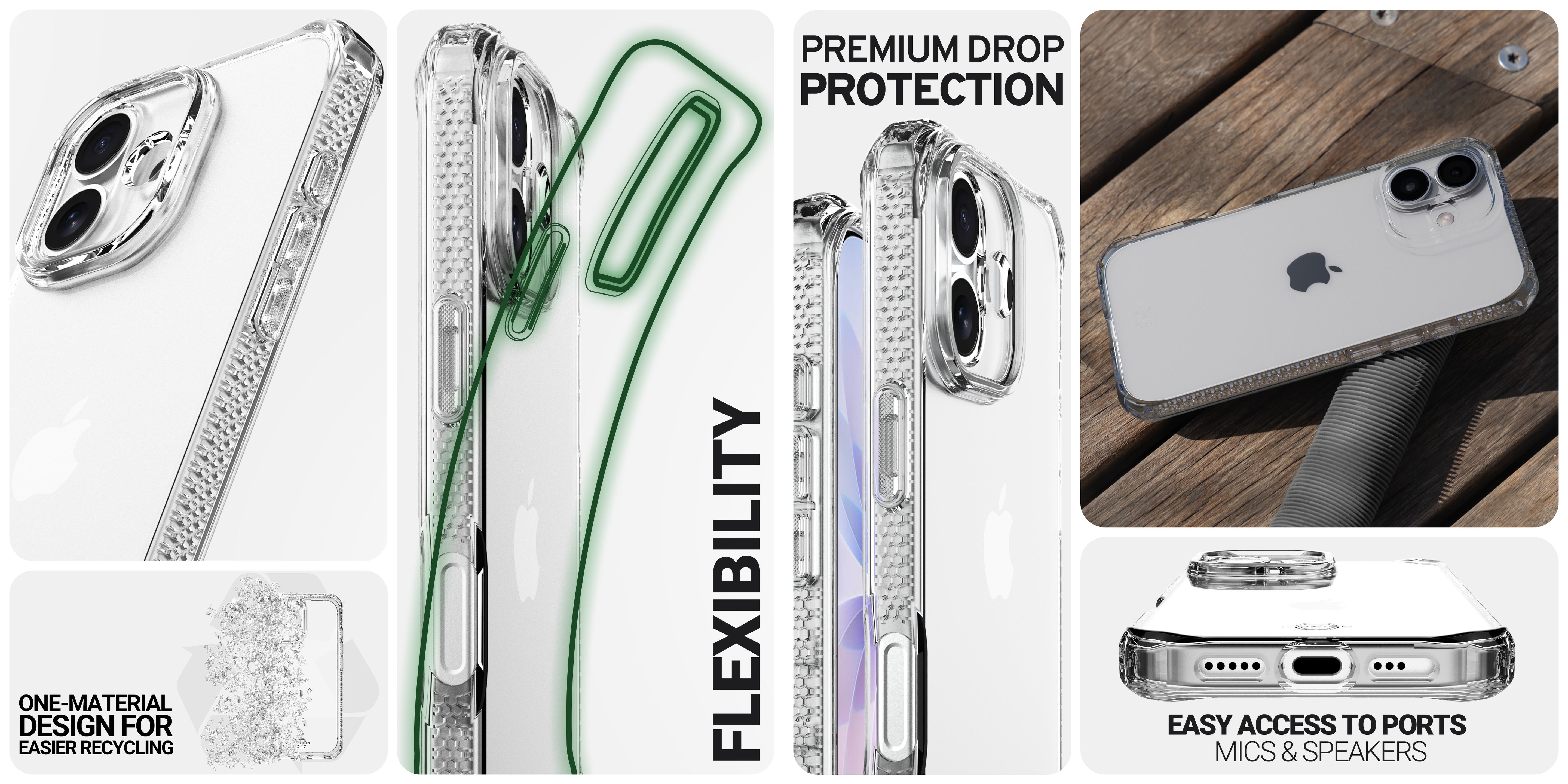 SPECTRUM_R CLEAR : Proprietary True Clear, Certified 100% Recycled, Mono-Material for Simplified Recycling. Offers AI-Enhanced Drop Protection up to 3M / 10FT, Superior Anti-Yellowing, and Antimicrobial Defense.