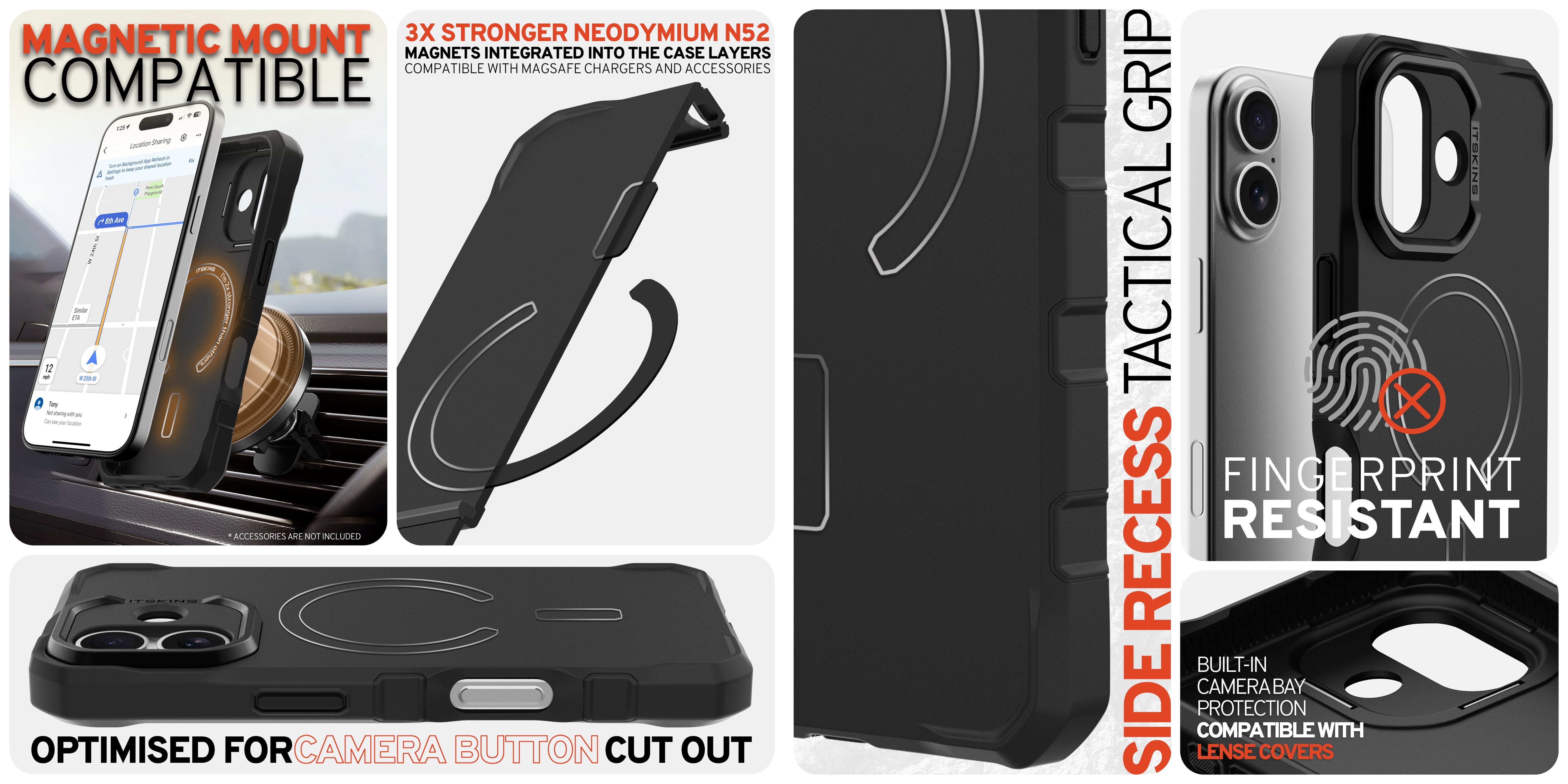 SUPREME R meets MIL-SPECS for military-grade defense, includes a tactical grip for enhanced hand security, and comes with detachable port covers for added protection. Engineered with XXL Air Corners for top-tier impact deflection. Boasts a 3X Stronger MagSafe for maximum attachment strength with accessories.