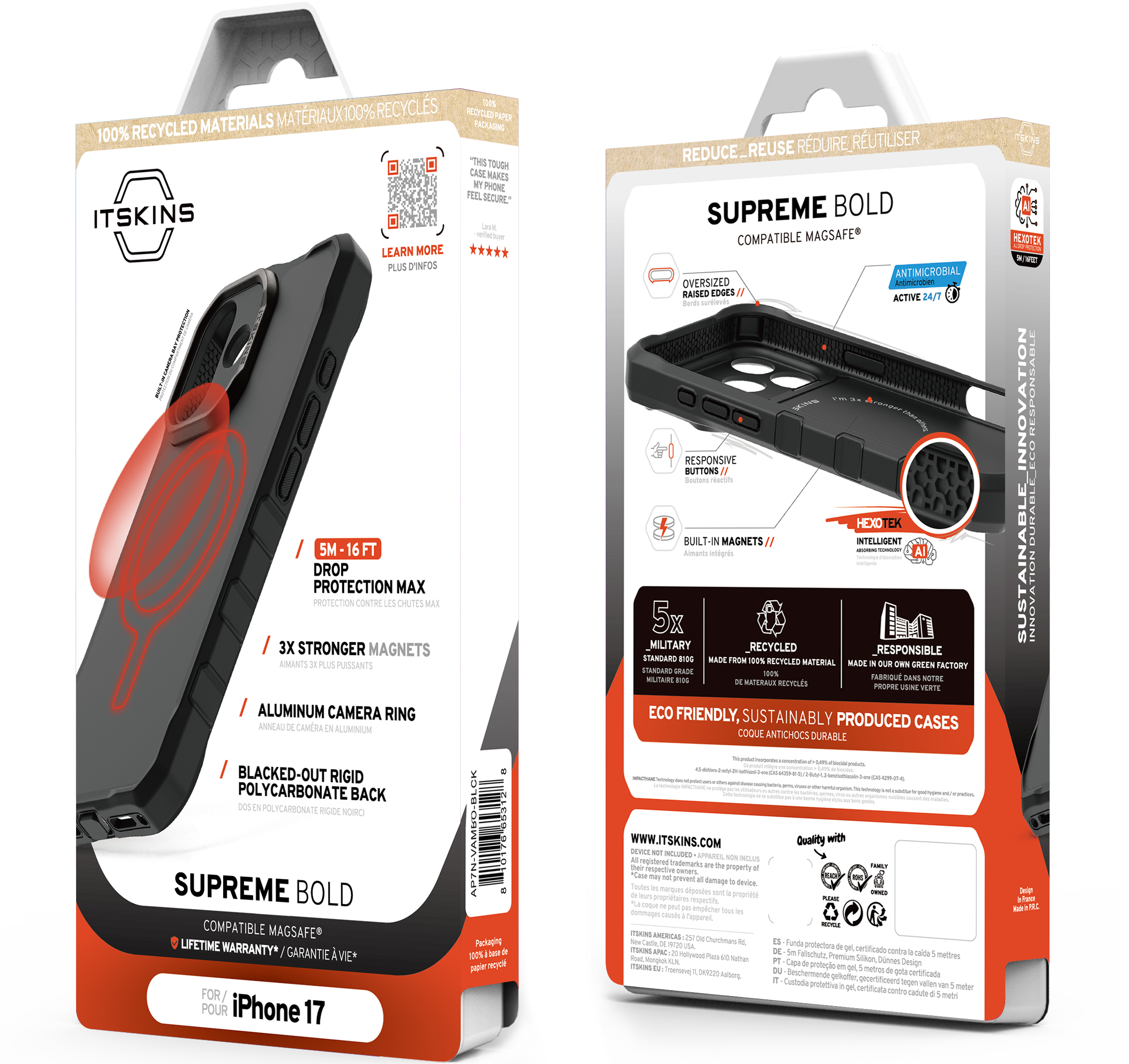 SUPREME R // BOLD : is one of our most protective case. Equipped with a Built-in Metal Plate compatible with car mounts for those needing a stronger attachment option than MagSafe provides. Enhanced with AI technology, it offers superior impact absorption around the interior perimeter, protecting your device from drops up to 4.5M / 15 Feet.
