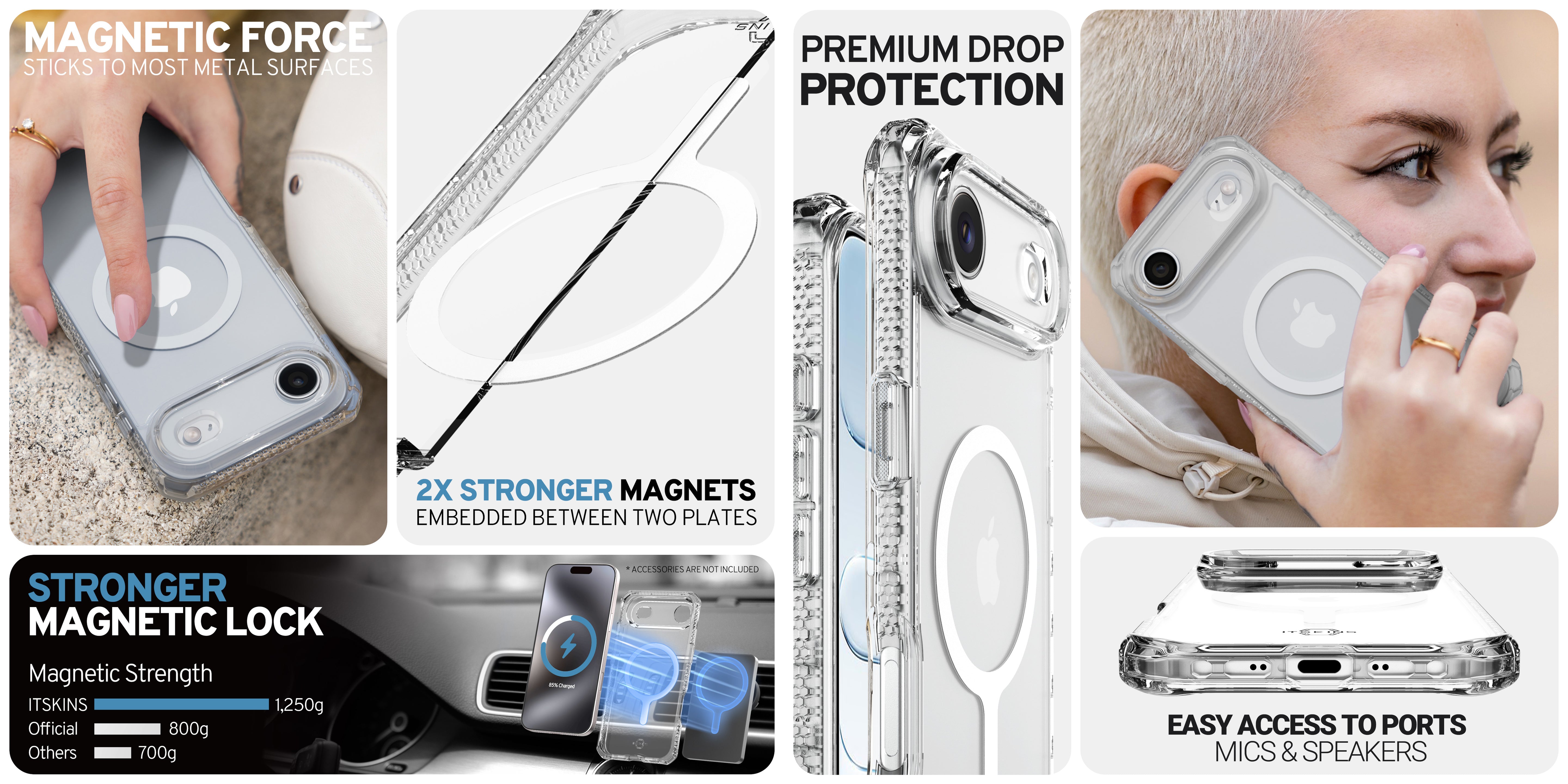 HYBRID_R CLEAR : Crafted for the Active, it features a never-yellowing, crystal-clear rigid polycarbonate back that showcases your phone's beautiful finish, 2X Stronger MagSafe and AI-Enhanced 3M / 10ft Drop Defense. It is Global Recycled Standard Certified, with an Eco-Friendly design incorporating Air-Pocket Corners, Antimicrobial Features, and Responsive Buttons. Comes with a Lifetime Warranty for Endless Adventures.