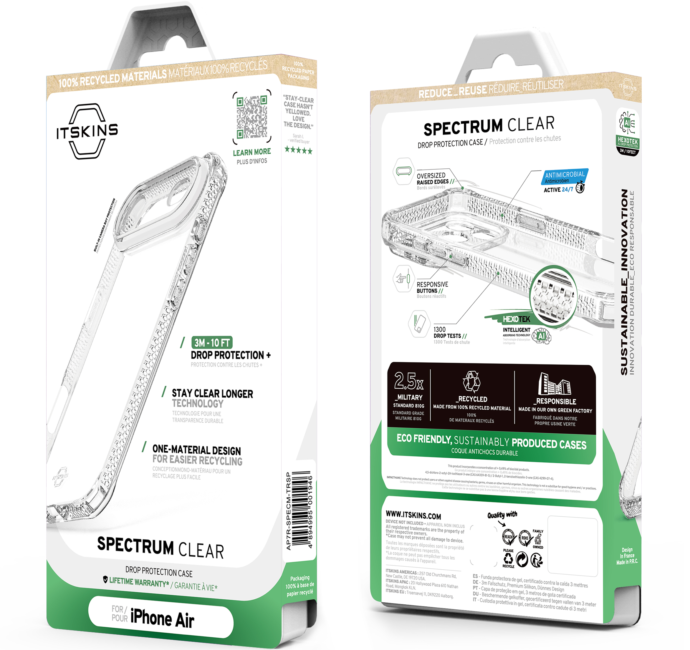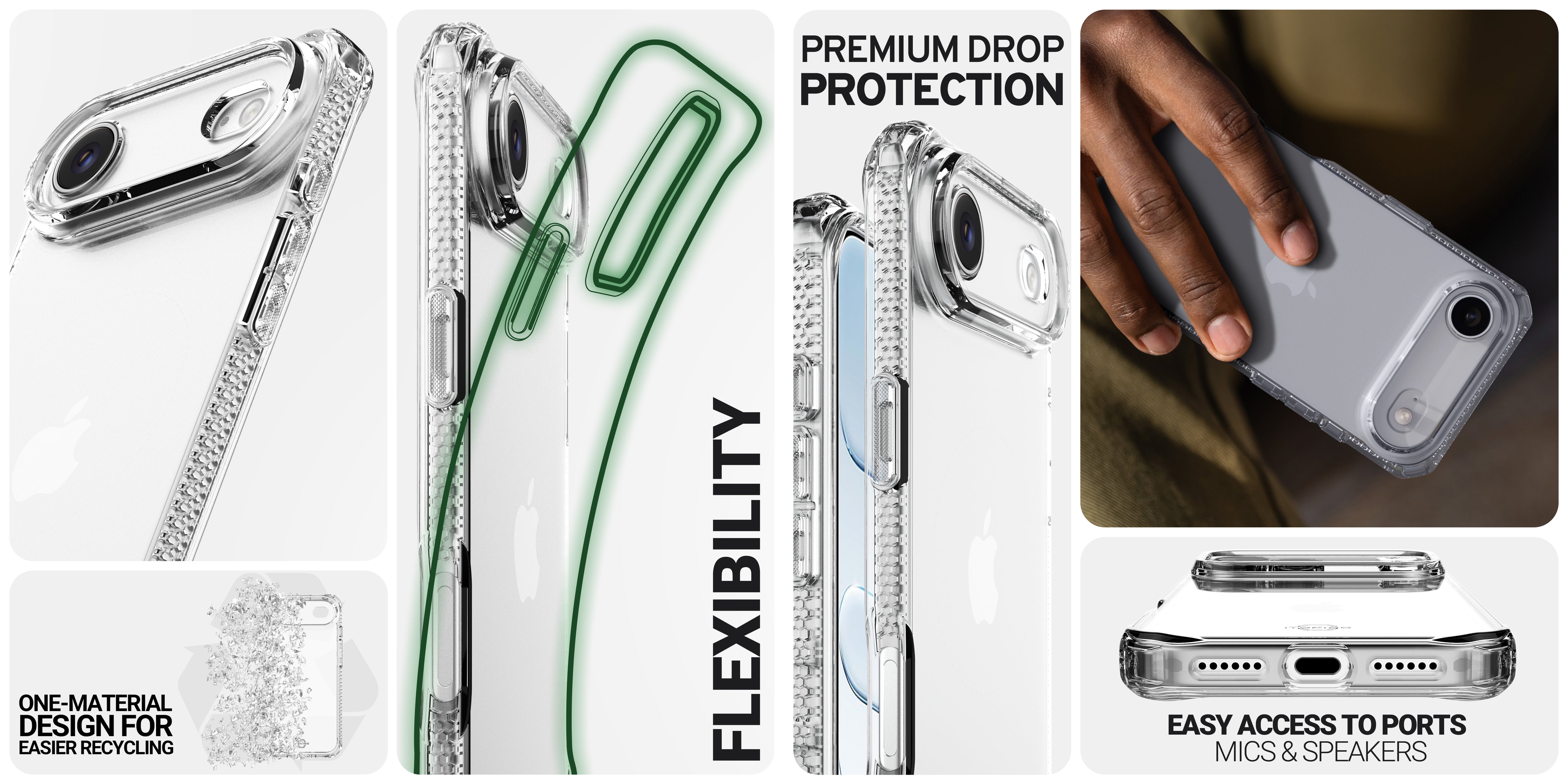 SPECTRUM_R CLEAR : Proprietary True Clear, Certified Recycled, Mono-Material for Simplified Recycling. Offers AI-Enhanced Drop Protection up to 3M / 10FT, Superior Anti-Yellowing, and Antimicrobial Defense.