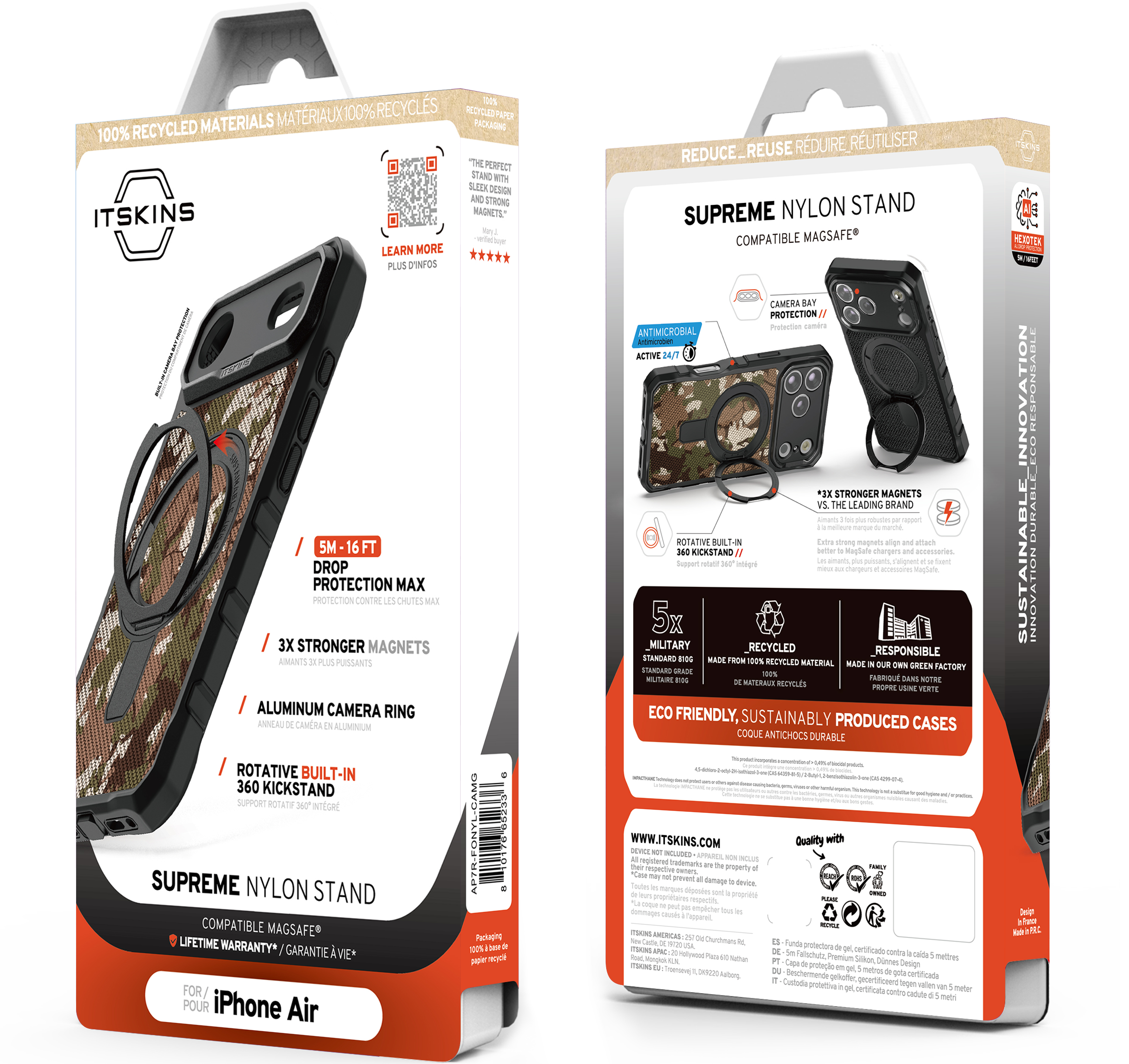 SUPREME_R NYLON : is the ultimate case with numerous advanced features. It is loaded with extra strong magnets embedded around a folding MagSafe-compatible stand to hold to any metal surfaces. Enhanced with AI technology, it offers superior impact absorption around the interior perimeter, protecting your device from drops up to 4.5M / 15 Feet.