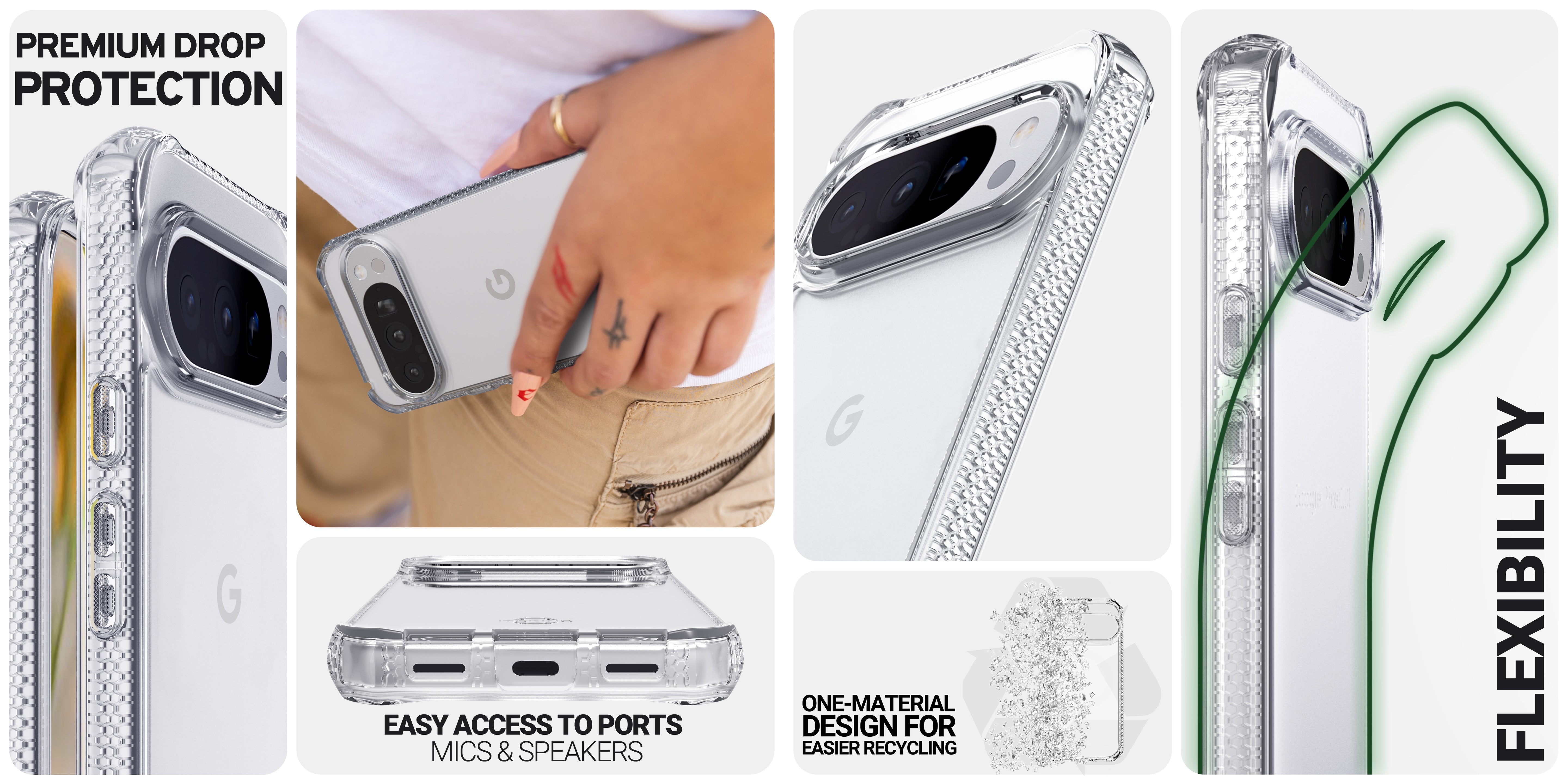 SPECTRUM_R CLEAR : Proprietary True Clear, Certified Recycled, Mono-Material for Simplified Recycling. Offers AI-Enhanced Drop Protection up to 3M / 10FT, Superior Anti-Yellowing, and Antimicrobial Defense.