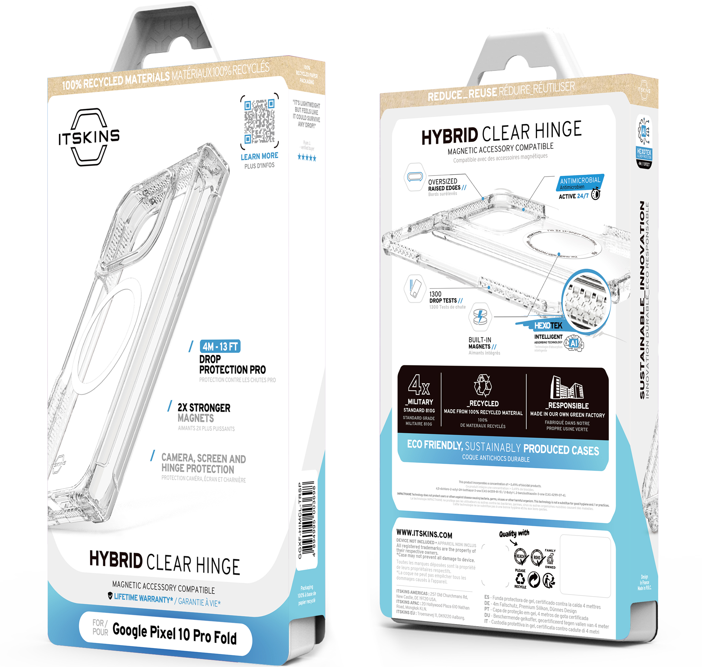 HYBRID_R // HINGE CLEAR Made from recycled materials, this slim, crystal-clear case lets you show off your phone’s premium design. It offers premium drop protection – up to 3M / 10 feet and ensures complete 360 protection of your device with a removable hinge feature. The hinge stays covered, and This also allows you to open and close your phone with each case stays in place with an innovative magnetic system.