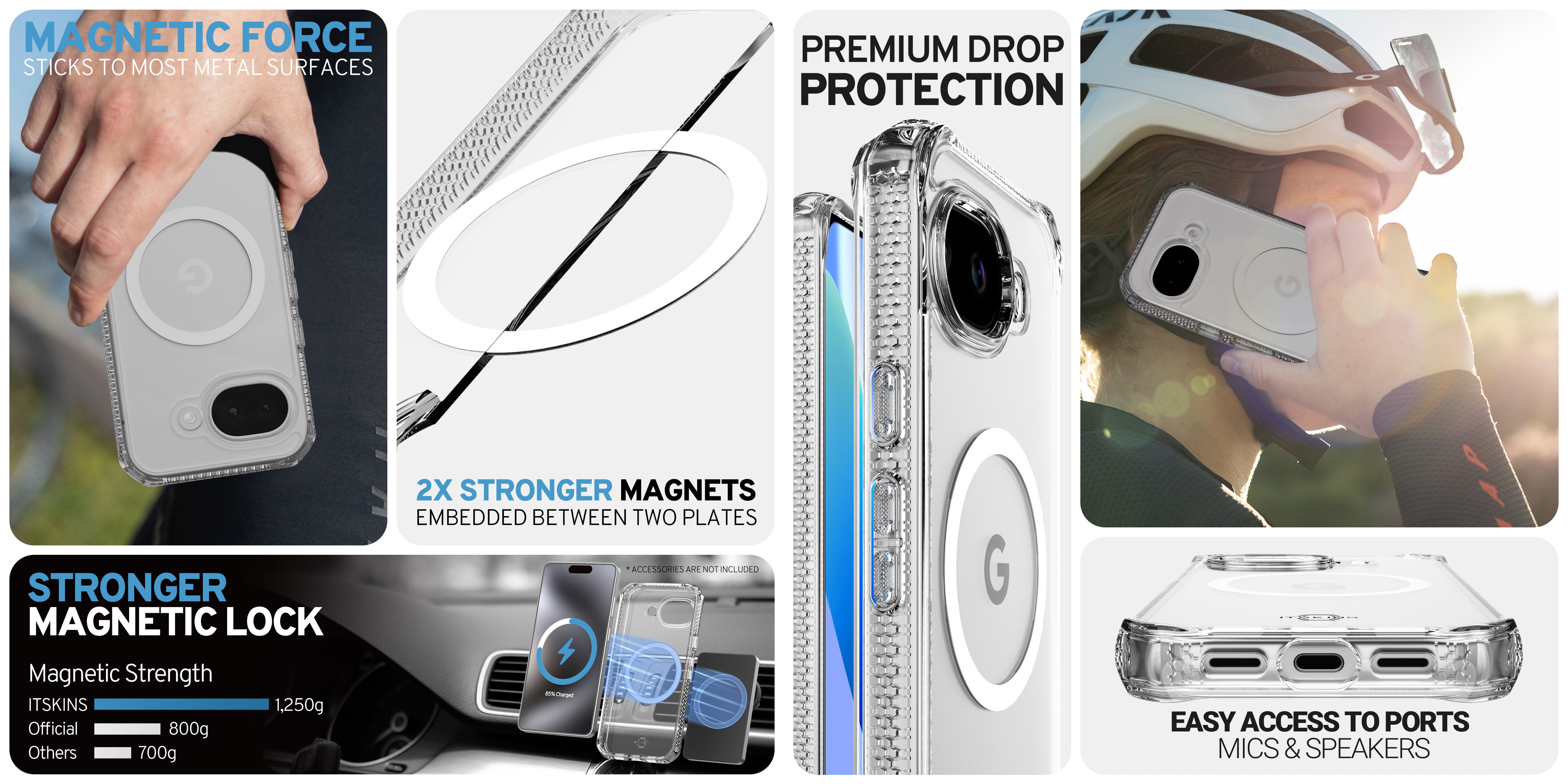 HYBRID_R CLEAR : Crafted for the Active, it features a never-yellowing, crystal-clear rigid polycarbonate back that showcases your phone's beautiful finish, 2X Stronger MagSafe and AI-Enhanced 4M / 13FT Drop Defense. It is Global Recycled Standard Certified, with an Eco-Friendly design incorporating Air-Pocket Corners, Antimicrobial Features, and Responsive Buttons. Comes with a Lifetime Warranty for Endless Adventures.