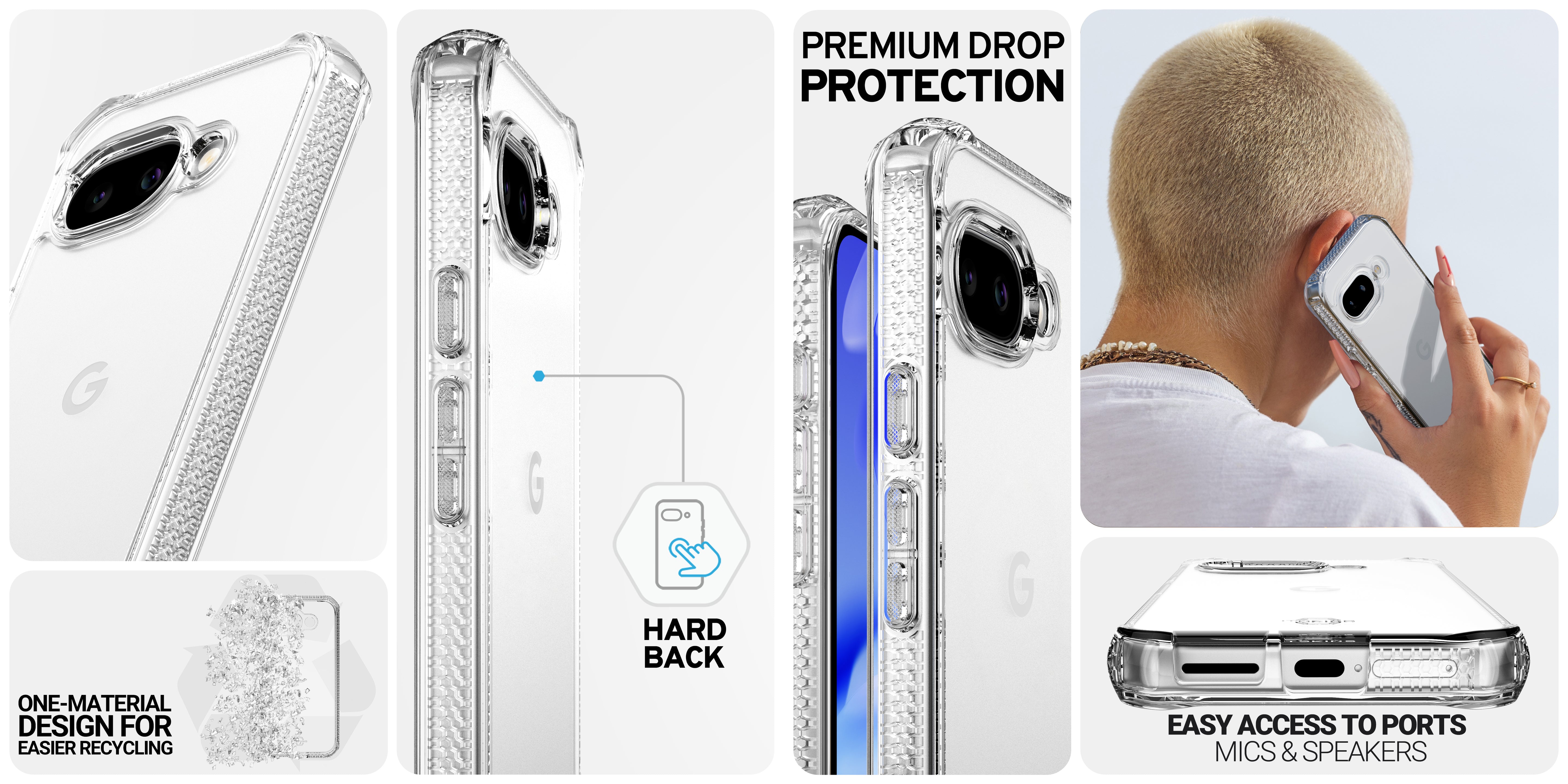 HYBRID R // CLEAR has been certified by the Global Recycled Standard for using recyclable materials and produced with sustainable methods wherever possible. It delivers premium drop protection and anti-yellowing antimicrobial defense.