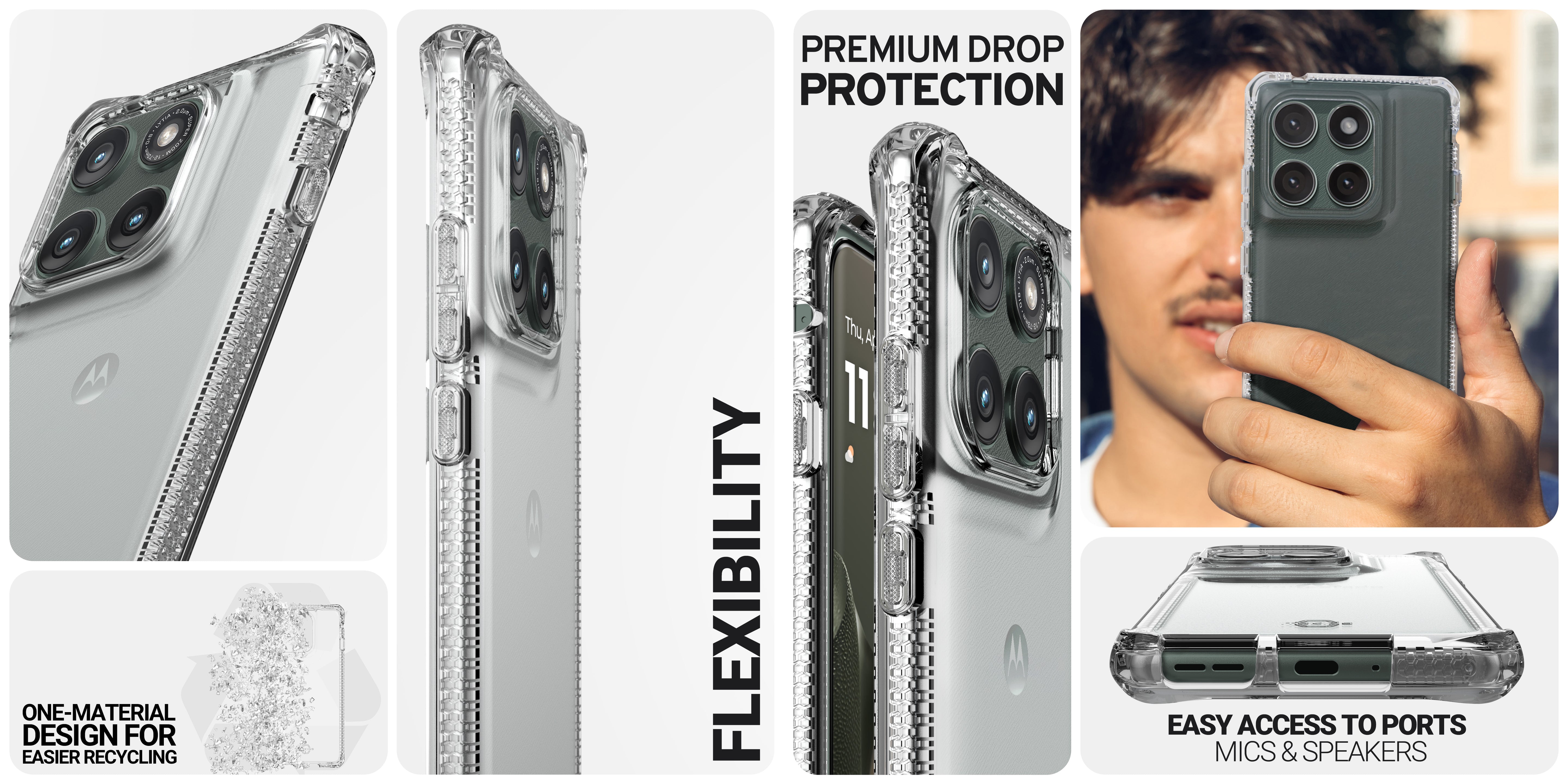 SPECTRUM_R CLEAR : Proprietary True Clear, Certified Recycled, Mono-Material for Simplified Recycling. Offers AI-Enhanced Drop Protection up to 3M / 10FT, Superior Anti-Yellowing, and Antimicrobial Defense.