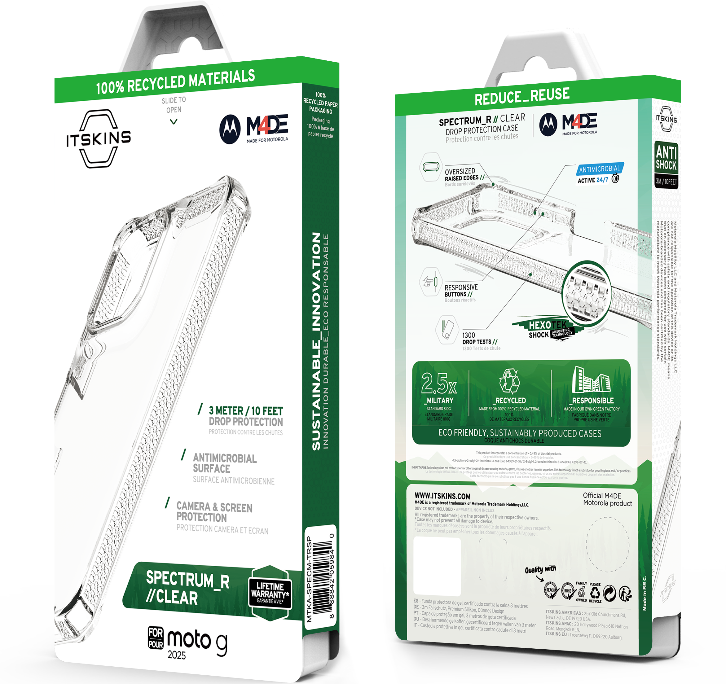 SPECTRUM_R CLEAR : Proprietary True Clear, Certified Recycled, Mono-Material for Simplified Recycling. Offers AI-Enhanced Drop Protection up to 3M/10FT, Superior Anti-Yellowing, and Antimicrobial Defense.