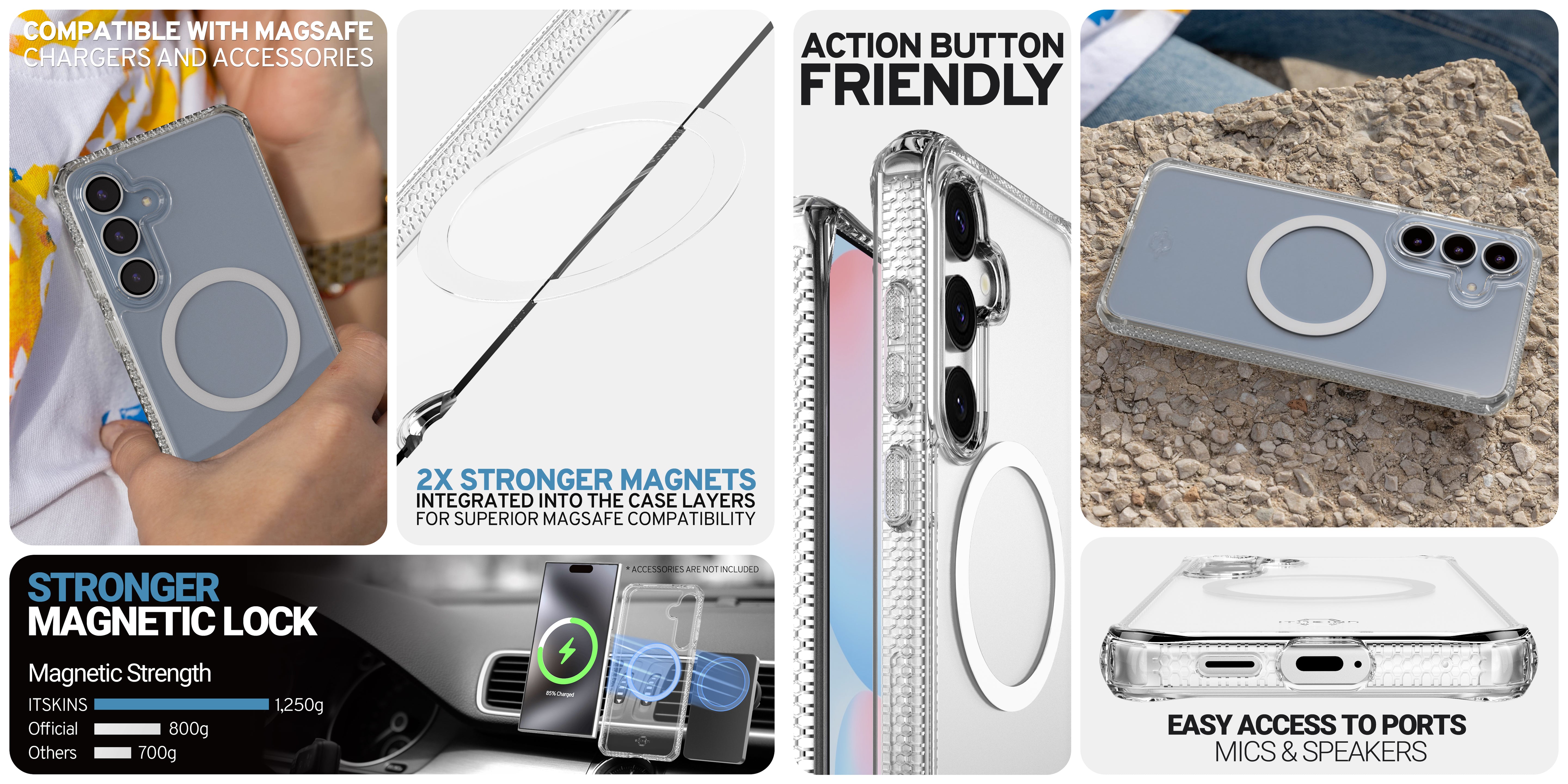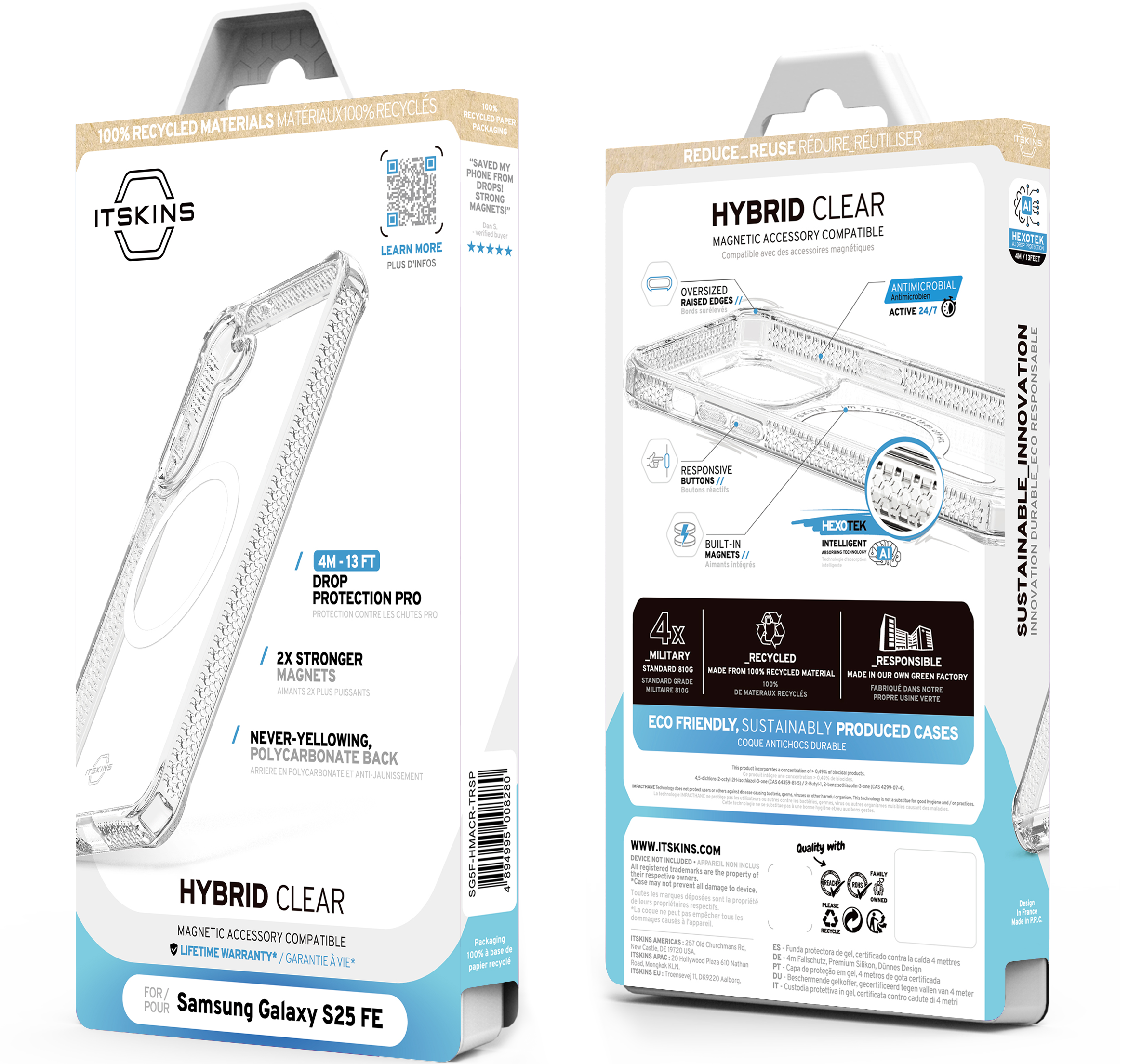 HYBRID_R CLEAR : Crafted for the Active, it features a never-yellowing, crystal-clear rigid polycarbonate back that showcases your phone's beautiful finish, 2X Stronger MagSafe and AI-Enhanced 3M / 10ft Drop Defense. It is Global Recycled Standard Certified, with an Eco-Friendly design incorporating Air-Pocket Corners, Antimicrobial Features, and Responsive Buttons. Comes with a Lifetime Warranty for Endless Adventures.