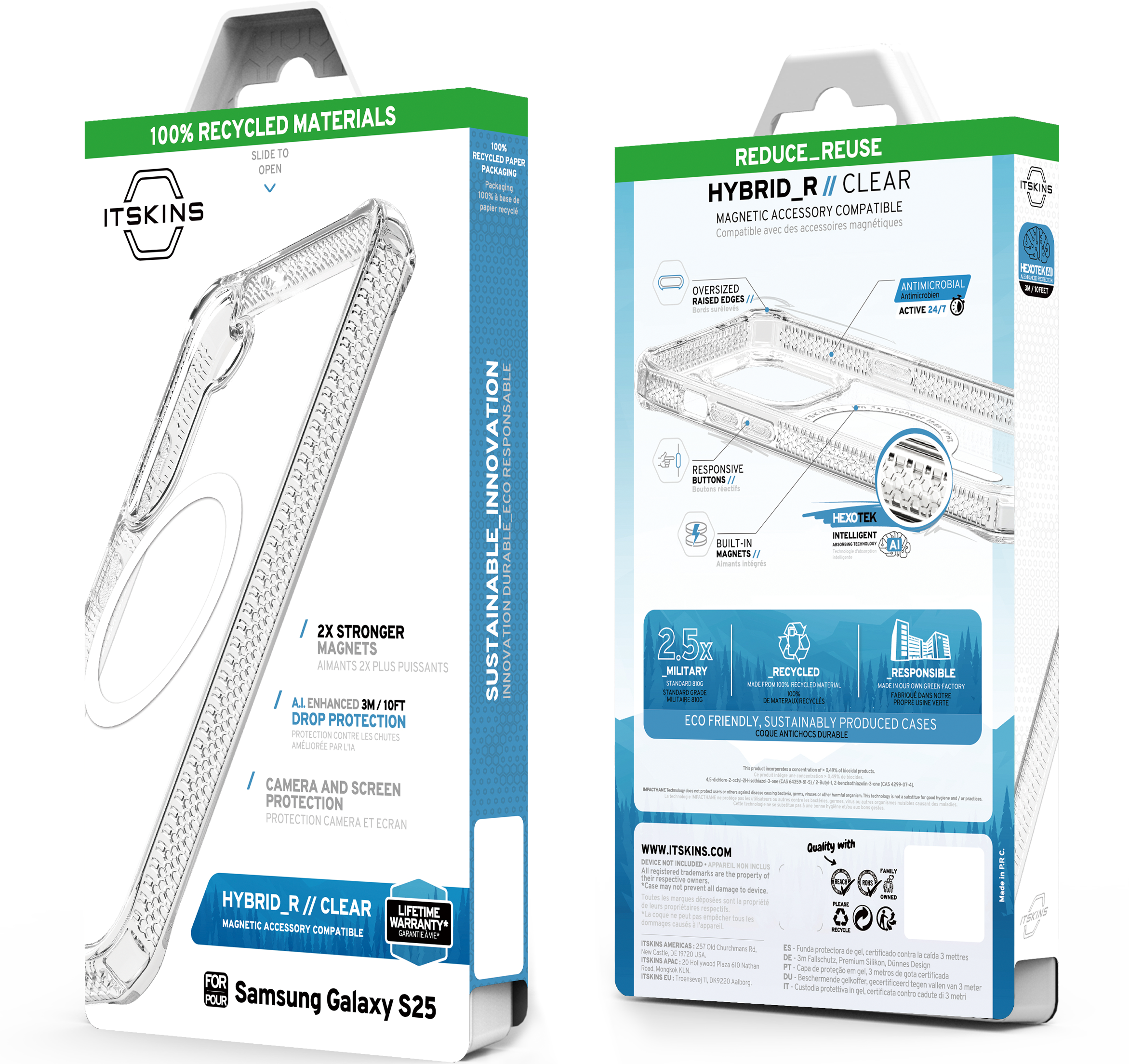 HYBRID_R // CLEAR has built-in magnets and is certified by the Global Recycled Standard for using recyclable materials and produced with sustainably. It delivers premium drop protection and anti-yellowing antimicrobial defense.