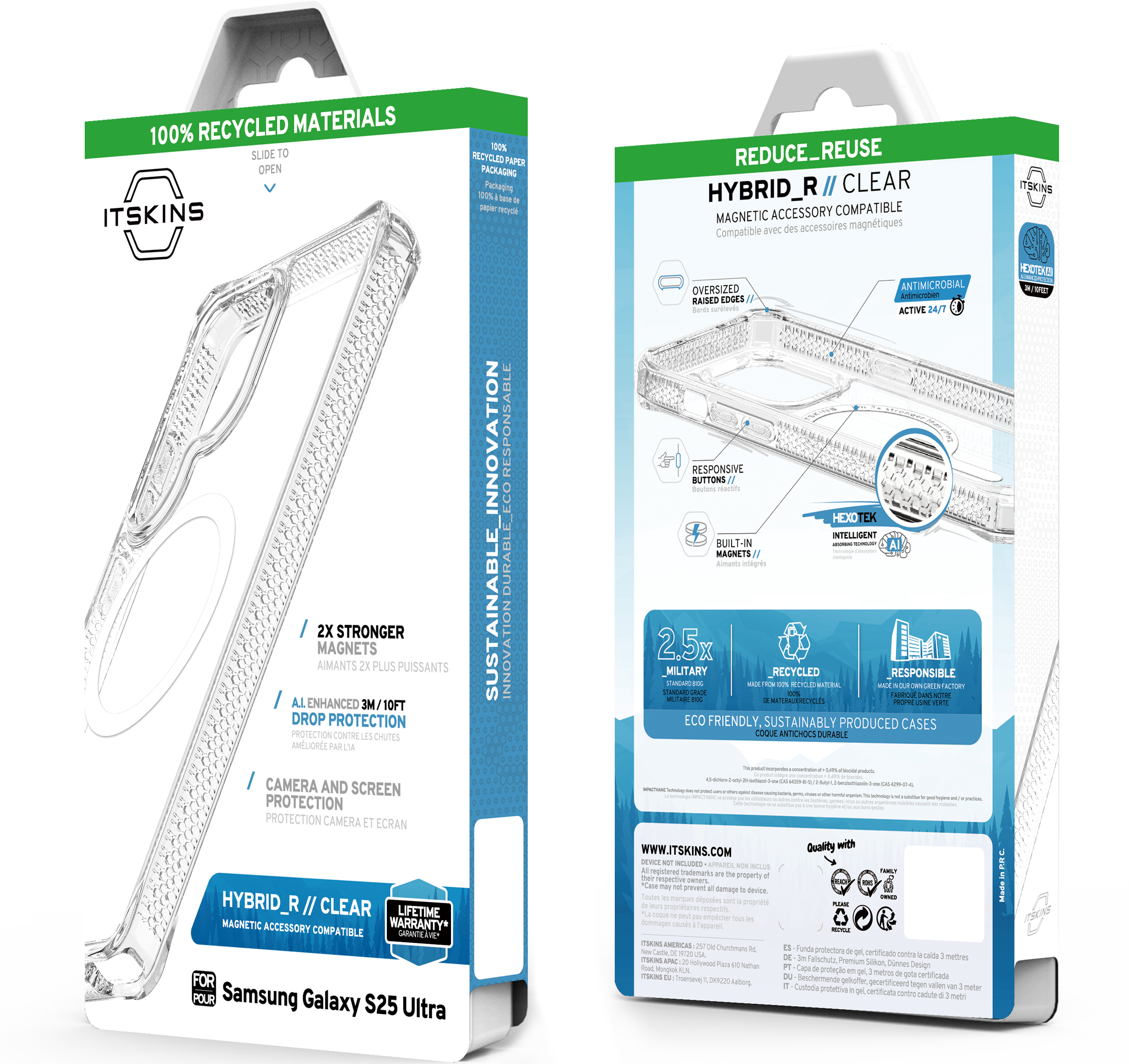 HYBRID_R // CLEAR has built-in magnets and is certified by the Global Recycled Standard for using recyclable materials and produced with sustainably. It delivers premium drop protection and anti-yellowing antimicrobial defense.