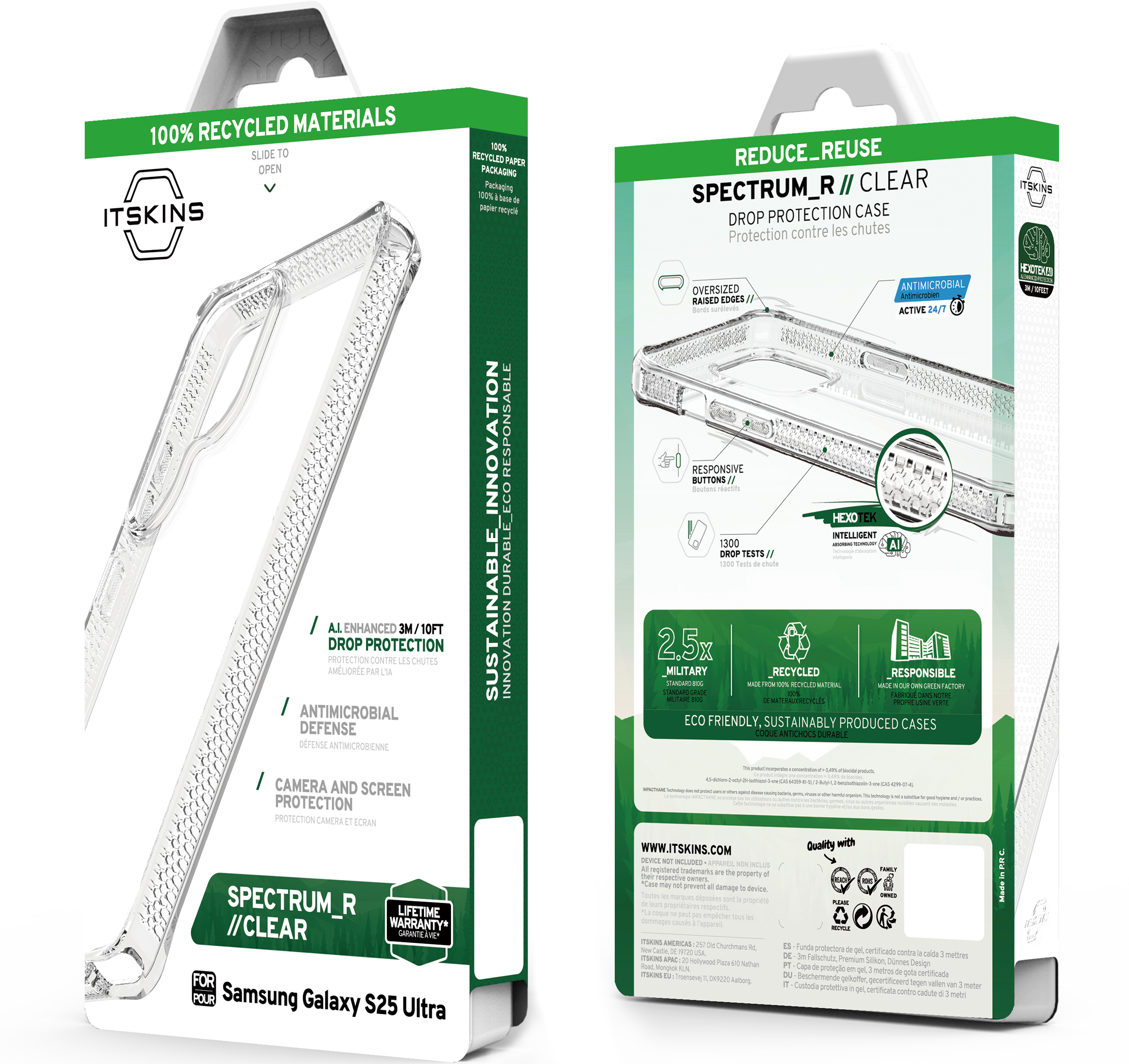 SPECTRUM_R CLEAR : Proprietary True Clear, Certified Recycled, Mono-Material for Simplified Recycling. Offers AI-Enhanced Drop Protection up to 3M / 10FT, Superior Anti-Yellowing, and Antimicrobial Defense.