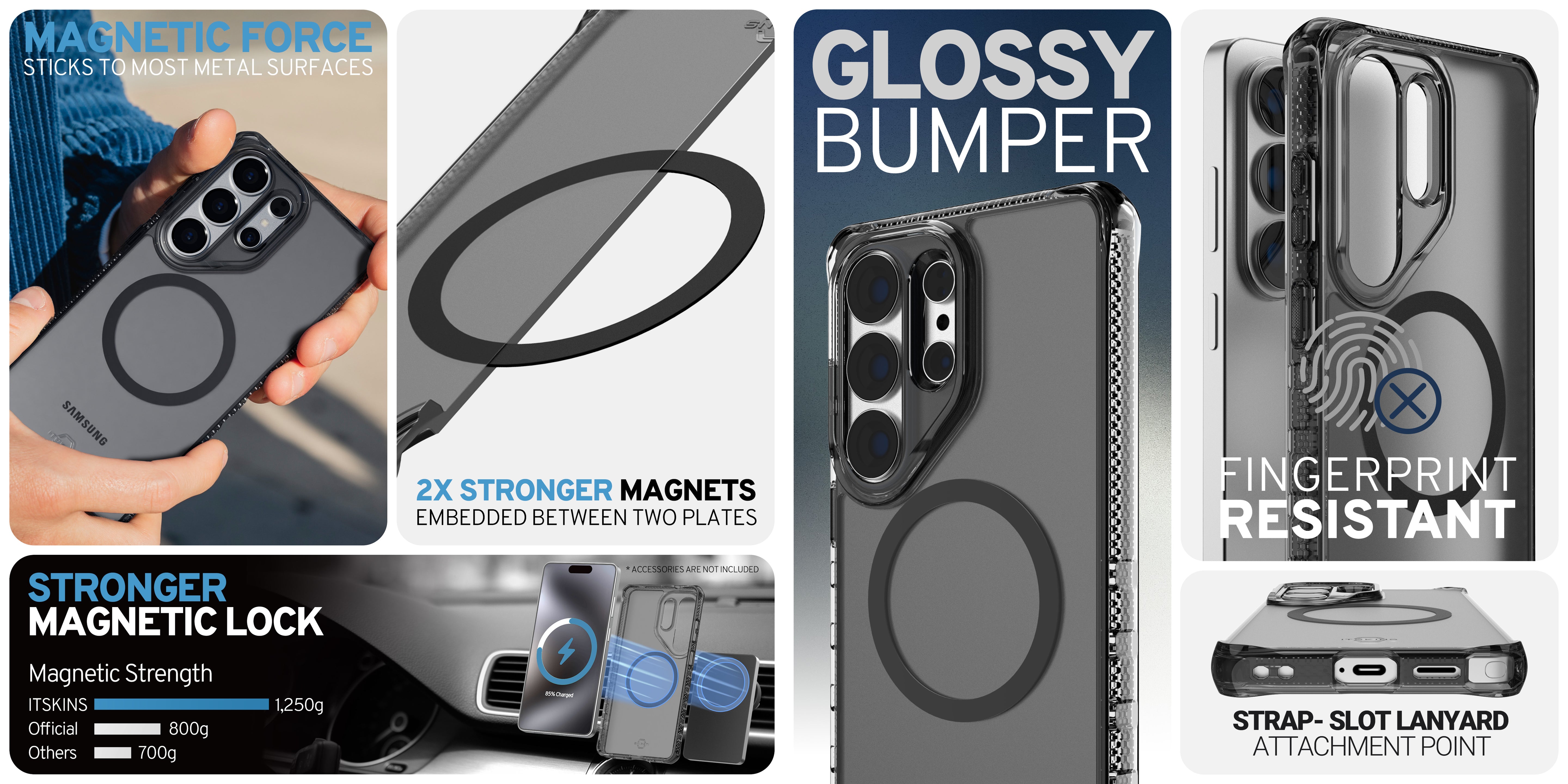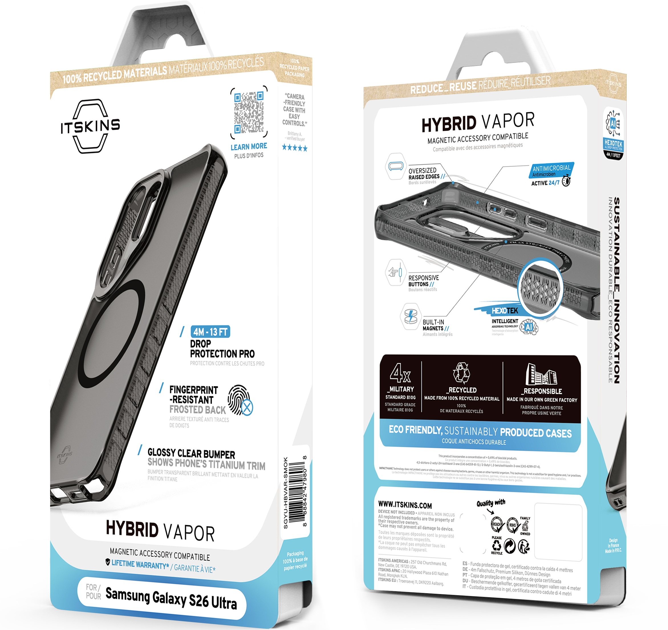 HYBRID R // VAPOR w/ MagSafe combines a sleek, matte frosted hardback with a glossy clear bumper, showcasing your phone's titanium trim. Its fingerprint-resistant, anti-scratch back surface maintains beauty over time. It is integrated with 2X Stronger MagSafe for secure attachment, AI-optimized for up to 4M / 13FT drop protection, and eco-friendly with Global Recycled Standard Certification. Equipped with air-pocket corners, antimicrobial defense, and responsive buttons, it's prepared for any adventure with a Lifetime Warranty.