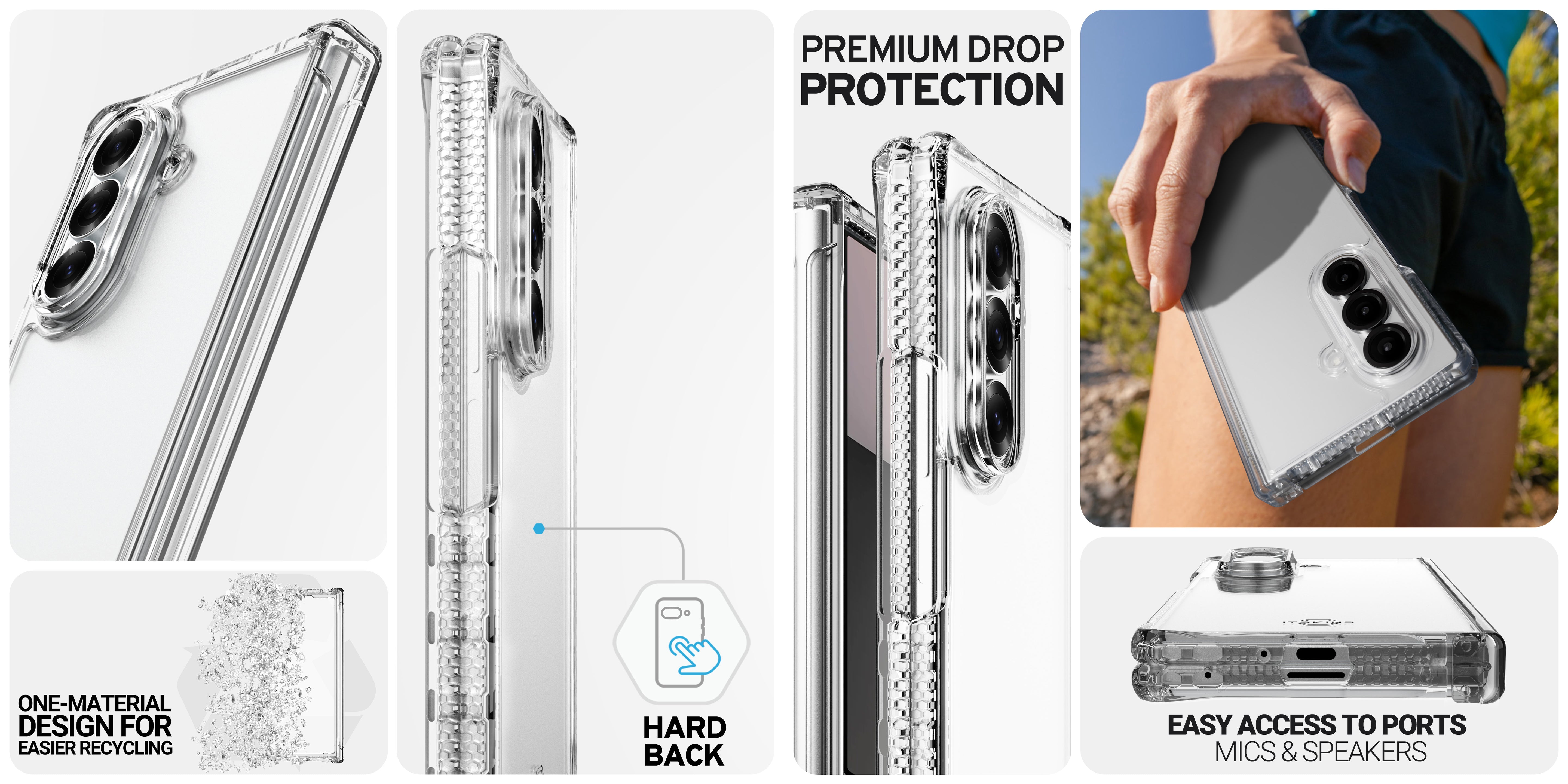 HYBRID_R CLEAR // HINGE Made from recycled materials; this slim, crystal-clear case lets you show off your phone’s premium design. It offers premium drop protection – up to 3M / 10 feet and ensures complete 360 protection of your device with a removable hinge feature. The hinge stays covered, and This also allows you to open and close your phone with either case stays in place with an innovative magnetic system.